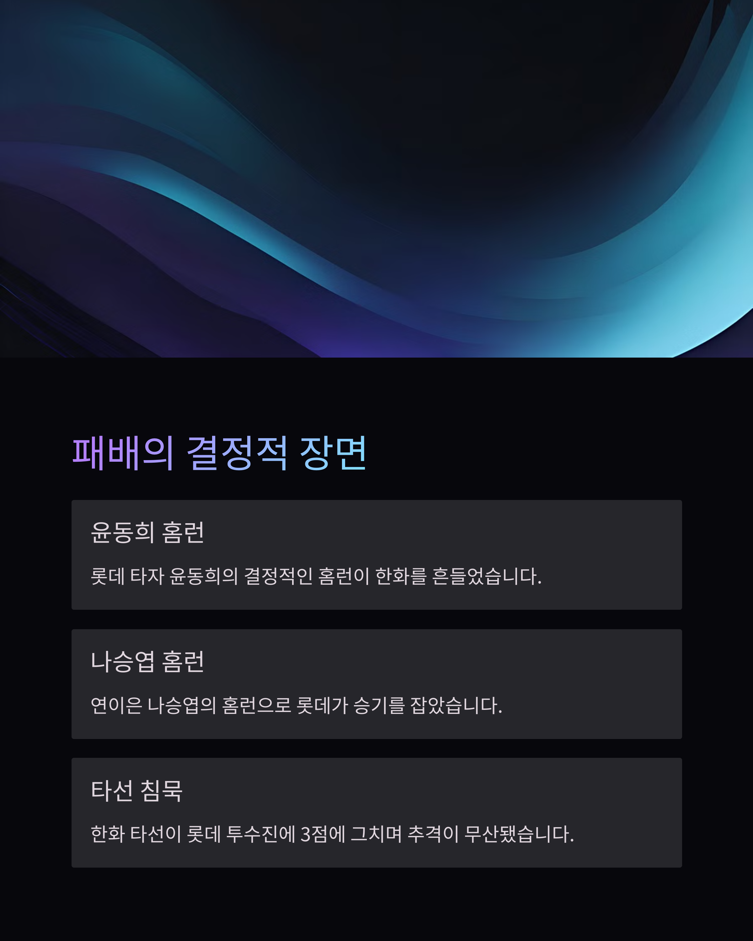 경기 중반 이후 롯데는 윤동희와 나승엽의 홈런으로 경기 흐름을 가져왔습니다. 두 선수 모두 변화구 타이밍을 정확히 맞췄고, 류현진의 실투를 놓치지 않았죠. 이 두 방이 경기의 승패를 가른 결정타였습니다.