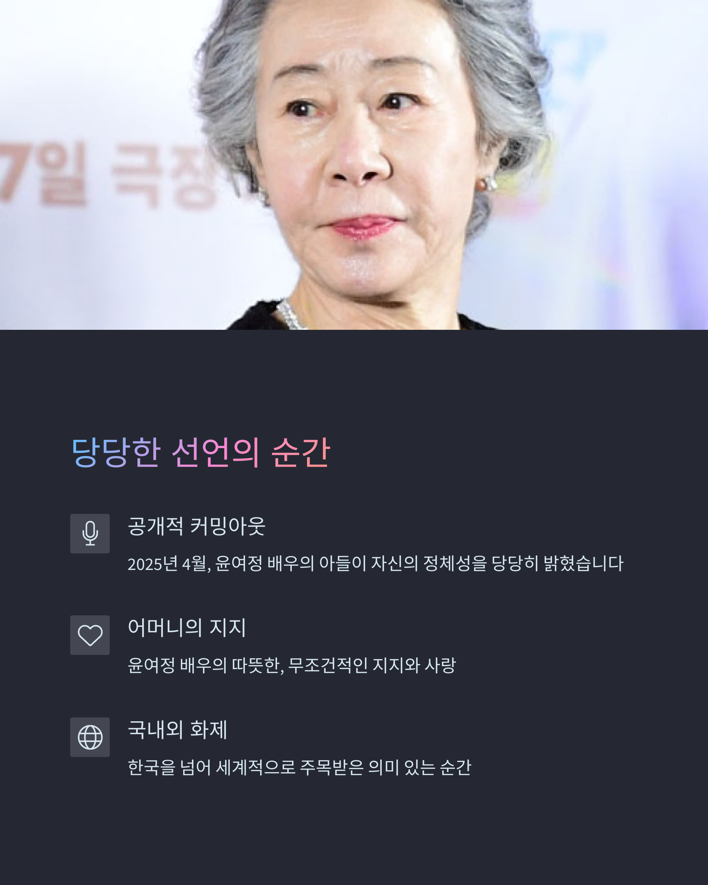 2025년 4월, 세계적인 배우 윤여정의 아들이 커밍아웃을 직접 밝히며 대중의 마음을 움직였습니다. 이건 단순한 뉴스가 아니라, 변화의 시작입니다.