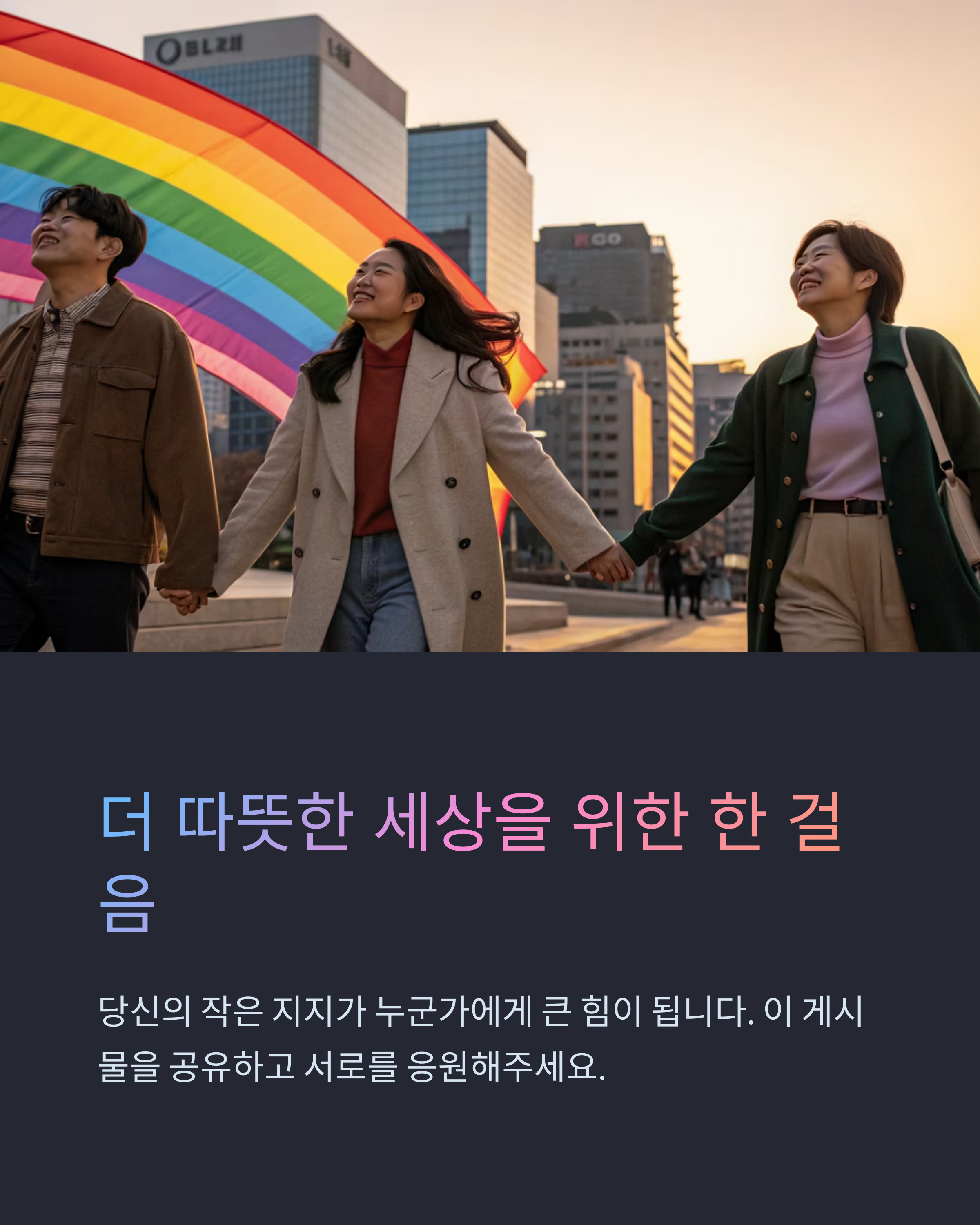 불과 10년 전만 해도 ‘커밍아웃’이라는 말은 낯설거나 위험한 단어처럼 여겨졌어요. 하지만 지금은 달라졌습니다. 2025년 현재, 한국은 젠더 다양성 존중 교육 의무화, 퀴어문화축제 전국 확대 등으로 변화를 맞이하고 있죠. 통계청 자료에 따르면 2022년 대비 2024년 기준 퀴어 커뮤니티 수용도는 38% → 55%로 상승했습니다. 사람들의 인식은 조금씩, 그러나 분명히 바뀌고 있어요.