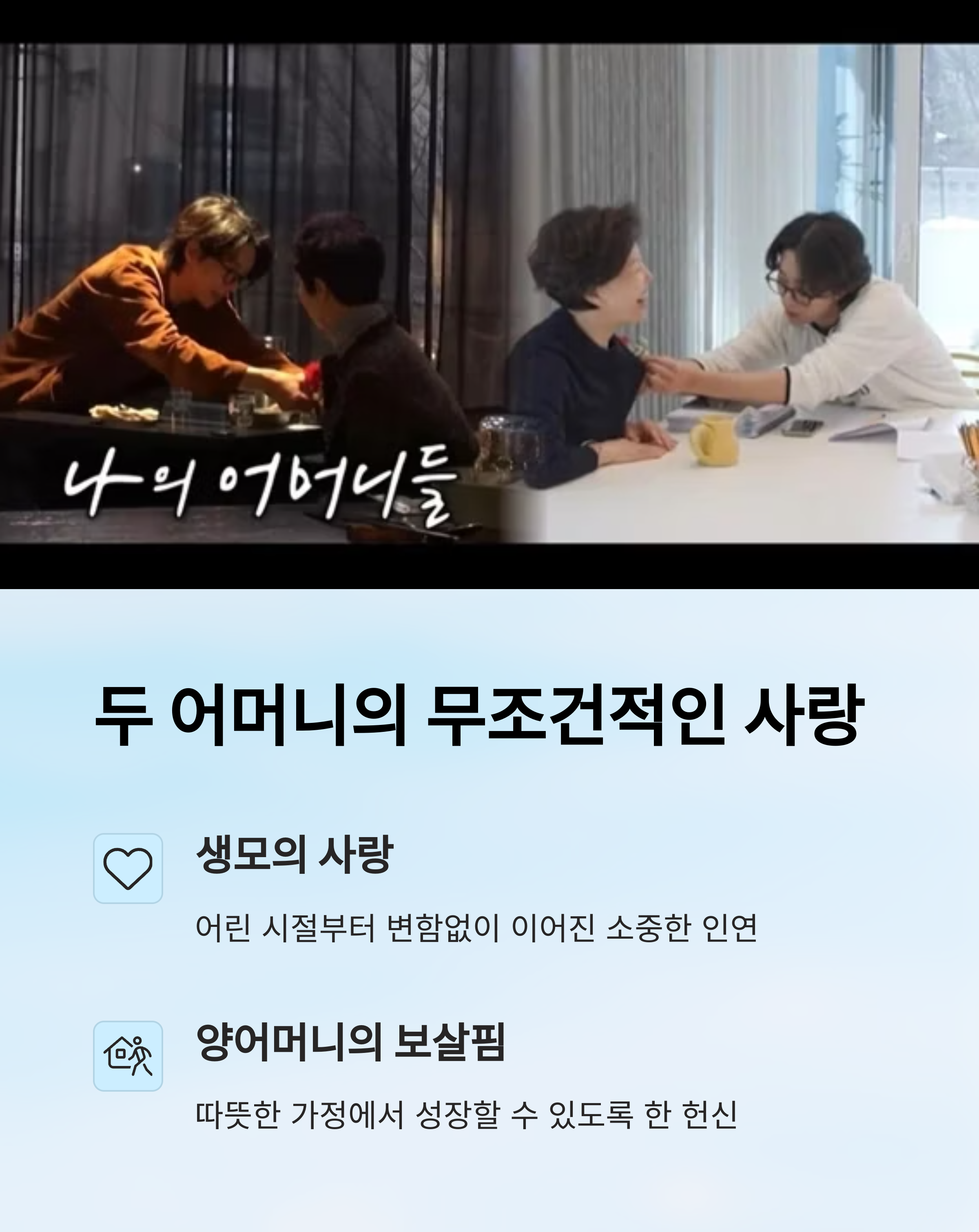 생모와 양어머니, 두 분의 사랑을 함께 받으며 성장한 특별한 가족 배경을 뜻합니다.