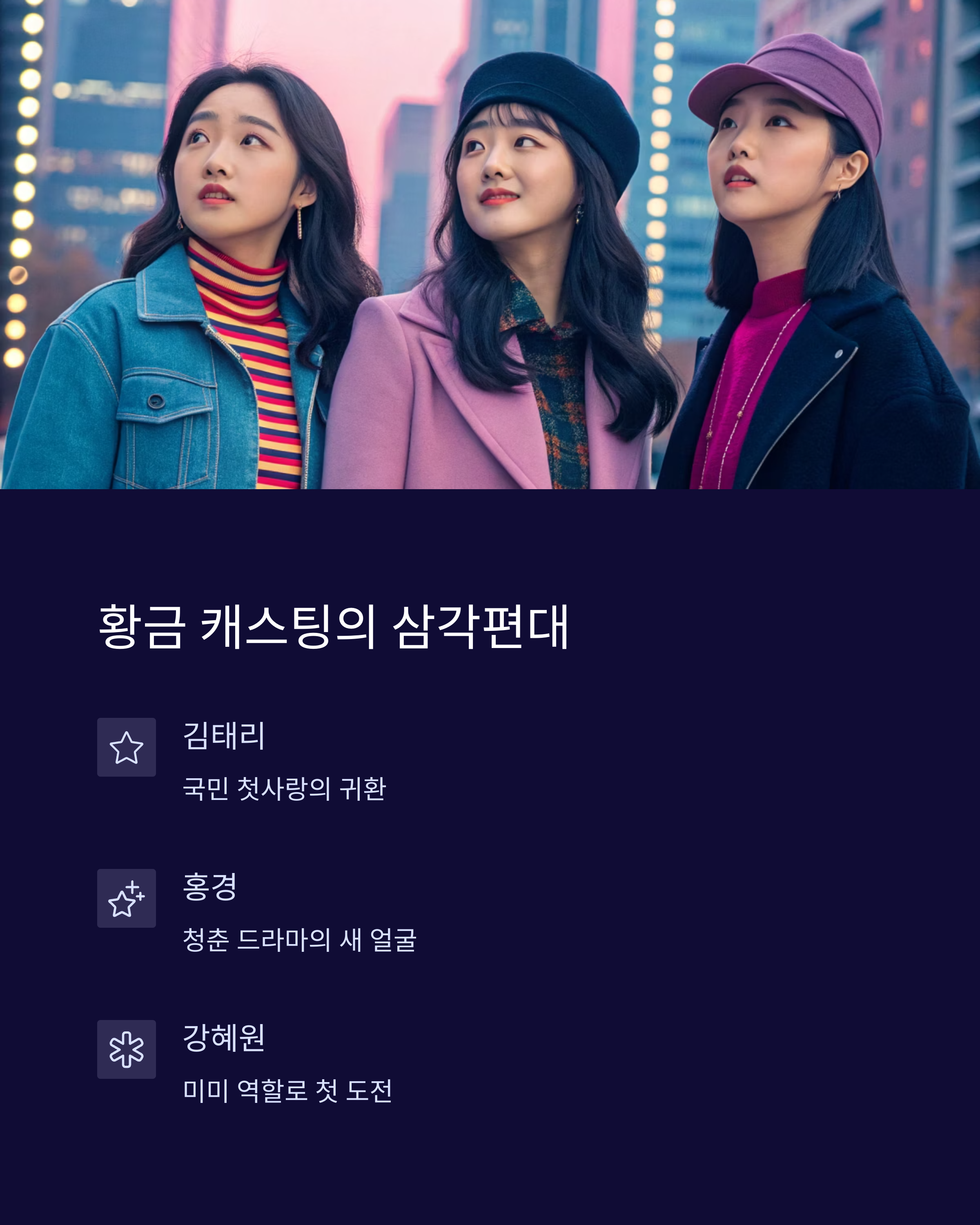 2025년 4월 공개된 공식 라인업에 따르면, '응답하라 2002' 주인공은 대세 배우 김태리와 떠오르는 신예 홍경이 맡았습니다! 김태리는 '서울 청담동 소녀' 역으로, 홍경은 '대구 출신 풋풋한 대학생' 역으로 등장할 예정인데요, 두 사람 모두 실제 2002년 감성에 딱 맞는 비주얼로 팬들의 기대를 한 몸에 받고 있어요.
