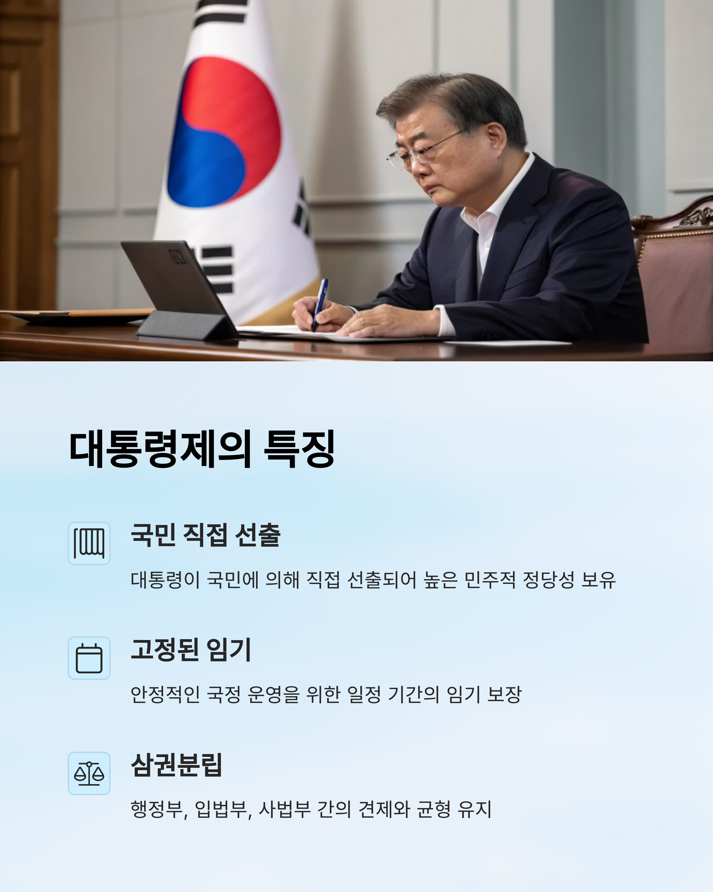 • 대통령제: 정해진 임기 동안 안정적인 정책 지속 가능