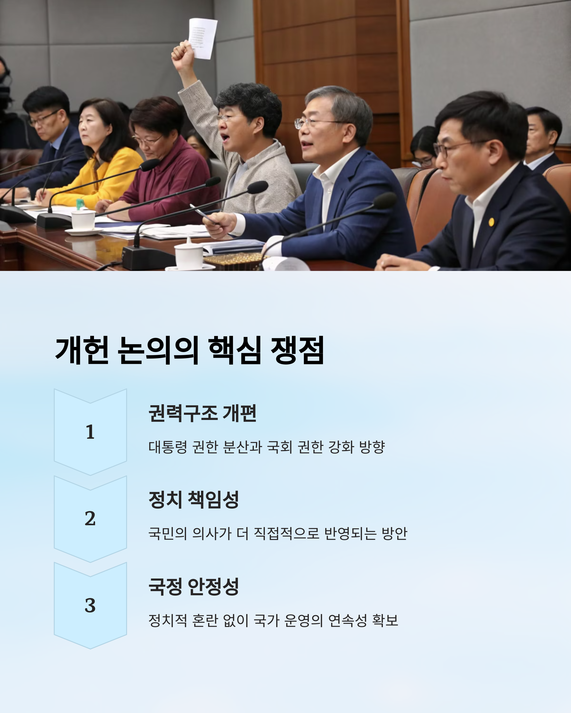 정치권에서는 개헌 분위기가 서서히 무르익고 있어요. 가능성은 점점 커지고 있습니다.