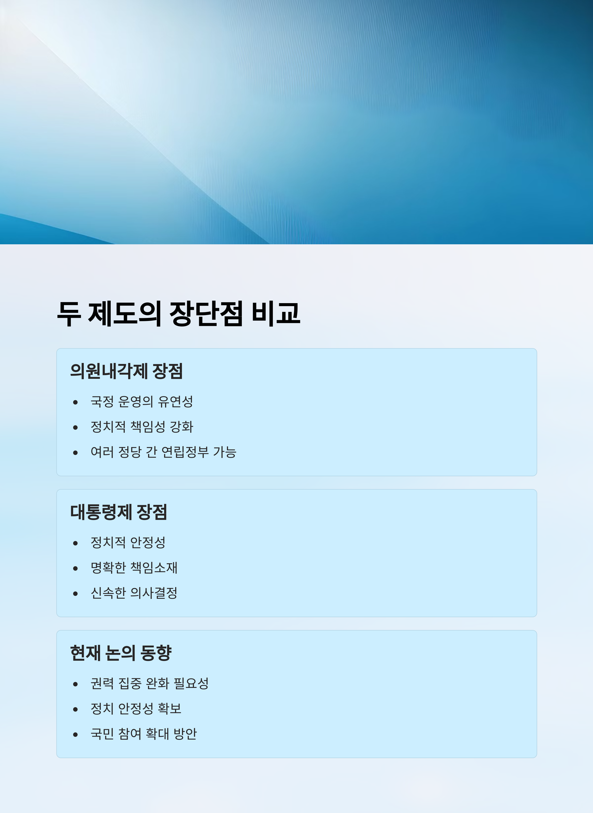 • 대통령제: 책임 정치가 약화될 수 있음 (잘못돼도 국회 탓, 청와대 탓 공방)