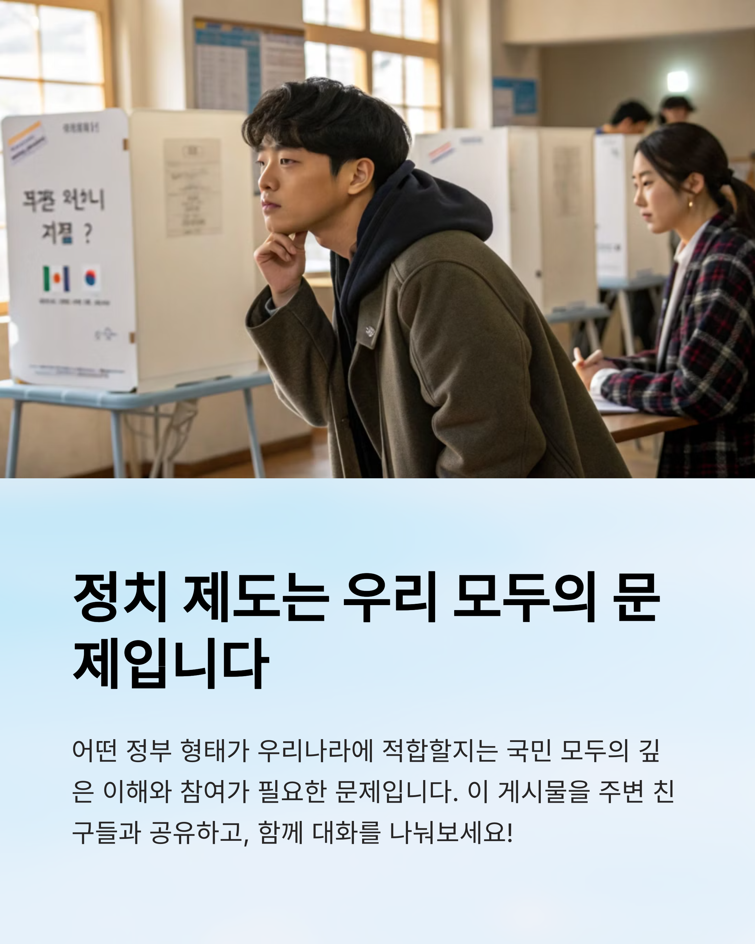 우리가 매일같이 뉴스에서 접하는 정치 제도, 이제는 좀 더 친근하게 다가오지 않으셨나요? 의원내각제와 대통령제, 각자의 장단점이 뚜렷하고 우리나라의 정치 문화와도 깊은 연관이 있죠. 앞으로 개헌 논의가 본격화된다면 이 두 제도 중 어떤 방향으로 갈지, 우리가 충분히 알고 고민할 필요가 있어요. 정치가 어려운 게 아니라, 설명이 어려웠던 거였다고 생각해요. 오늘 이 글을 통해 조금이라도 ‘아~ 이제 알겠다!’ 싶은 부분이 있으셨다면, 그걸로 충분히 의미 있는 시간이었을 거예요 :)