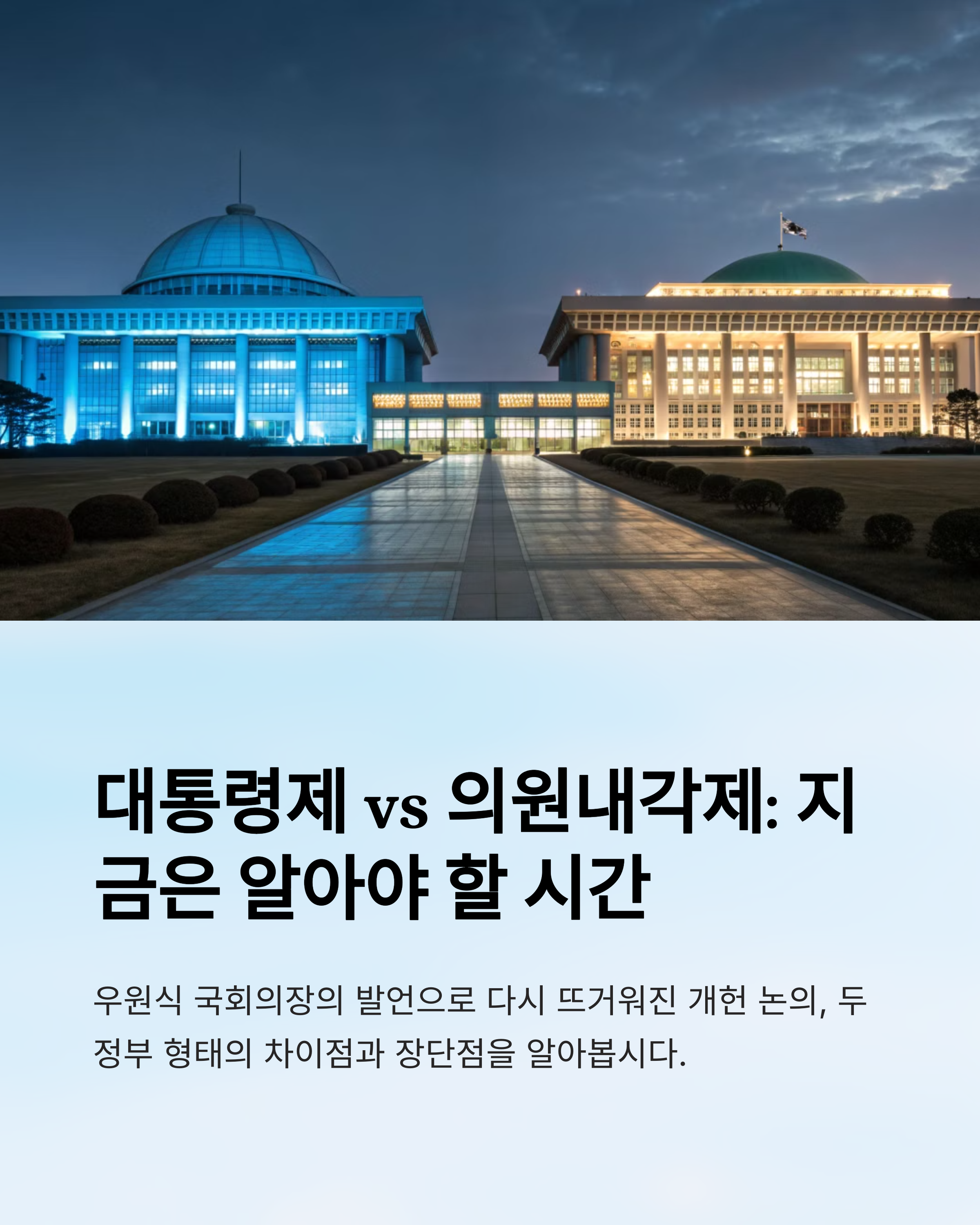최근 우원식 국회의장이 언급한 "의원내각제 고민"은 단순한 발언을 넘어 정치 제도 전반에 대한 개편 논의로 확산되고 있어요. 기존 대통령제의 한계가 여러 차례 지적되어 온 만큼, 앞으로 본격적인 개헌 논의로 이어질 수도 있겠다는 전망이 나오고 있죠.