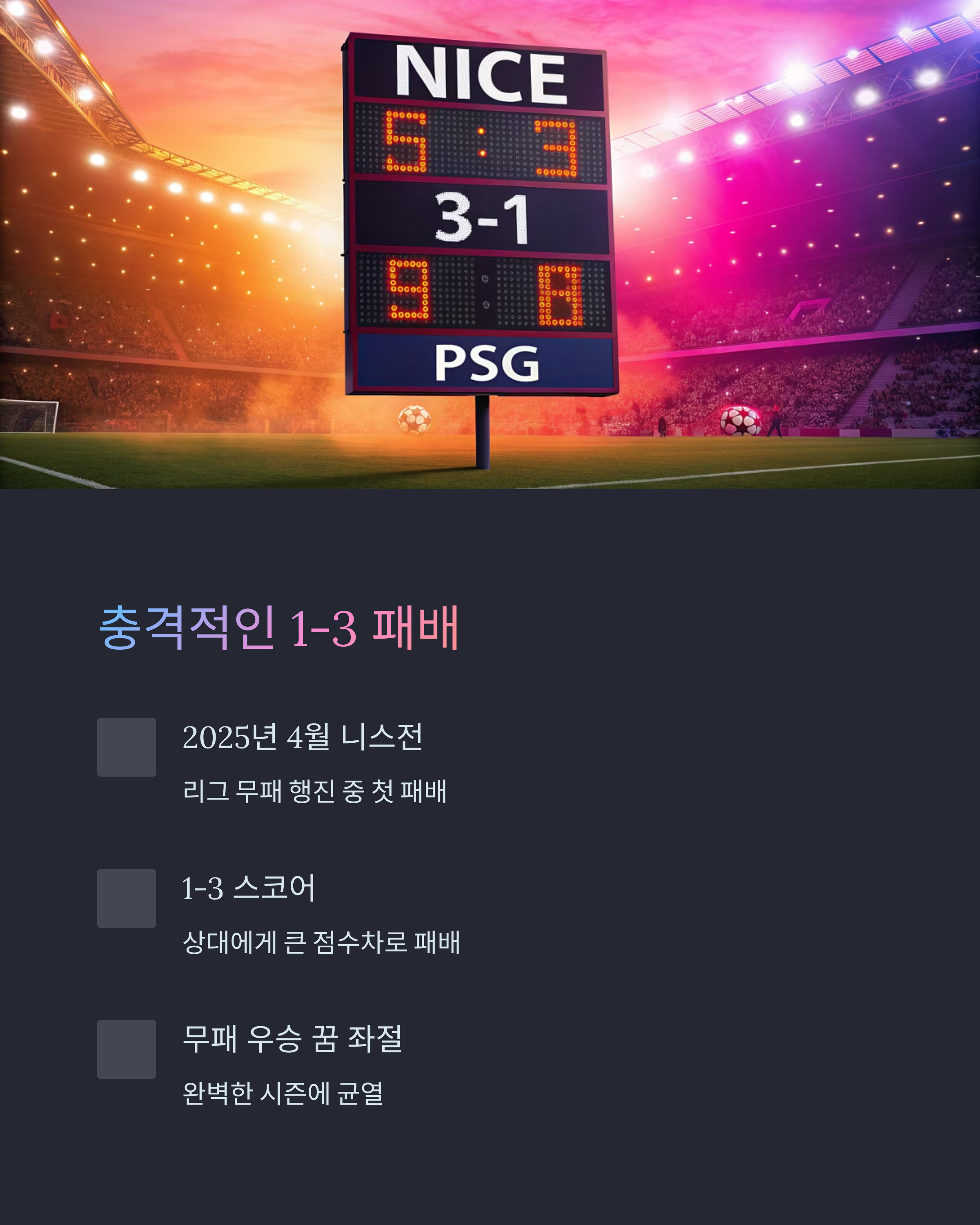 2025년 4월 25일, 프랑스 리그1 경기에서 파리 생제르맹(PSG)은 니스에게 1-3으로 충격적인 패배를 당했습니다. 특히 이강인 결장이 경기 전부터 화제를 모았고, 경기 시작 후부터 PSG의 조직력 붕괴가 눈에 띄었습니다. 최근 유럽축구 통계기관 'Opta'에 따르면, PSG는 이번 시즌 최악의 패스 성공률(78.4%)을 기록했다고 하네요. 무패 우승이라는 대기록은 결국 여기서 무너지고 말았습니다.