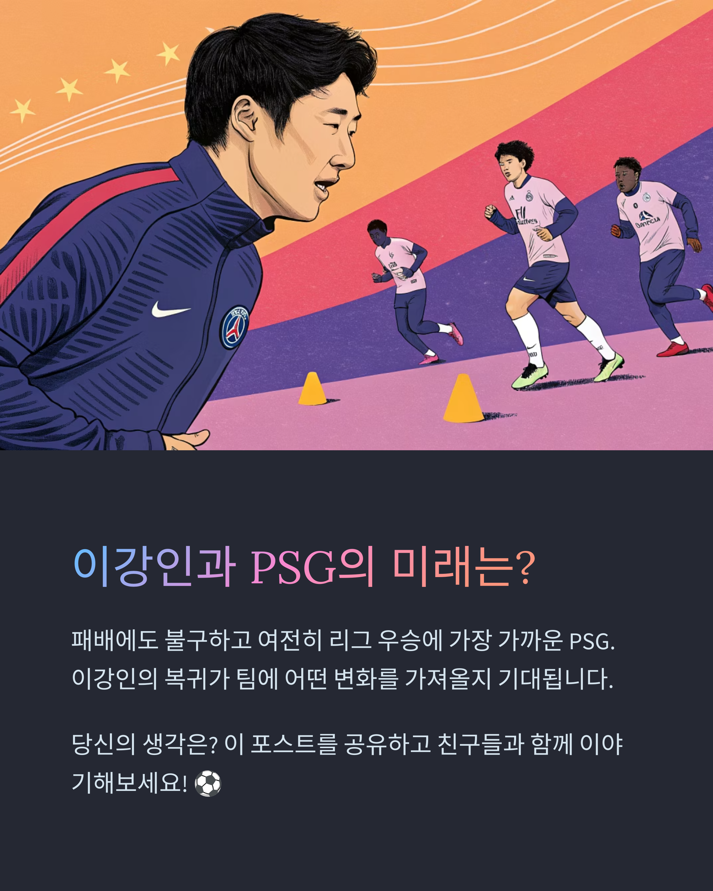 오늘은 이강인 결장과 함께 충격적인 PSG의 패배 소식을 전해드렸는데요, 여러분은 어떻게 보셨나요? 댓글로 여러분의 의견을 들려주세요! 앞으로 이강인의 복귀 소식과 PSG의 리그1 최종 결과를 계속해서 업데이트할 예정이니, 많은 관심 부탁드립니다. 축구는 언제나 예측 불가라서 더 흥미로운 것 같아요. 다음 글에서는 '챔피언스리그 준결승' 소식도 다룰 예정이니 기대해주세요!