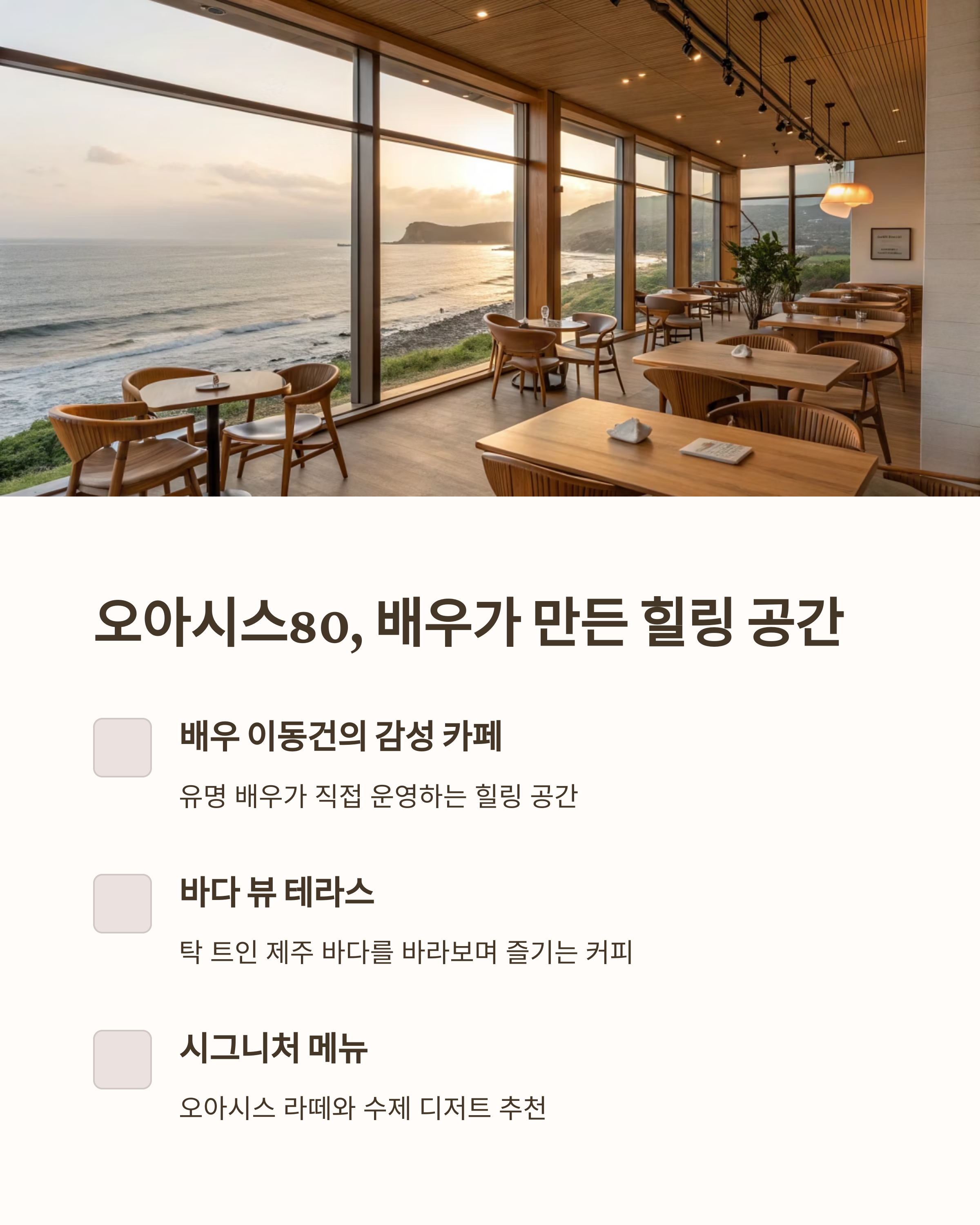 제주 애월, 그리고 이동건 배우의 감성이 담긴 오아시스80. 단순히 카페라기보다 '하루를 예쁘게 만드는 장소'라는 말이 딱 어울리는 곳이었어요. 직접 가서 보니 왜 이렇게 인기가 많은지 알겠더라고요.