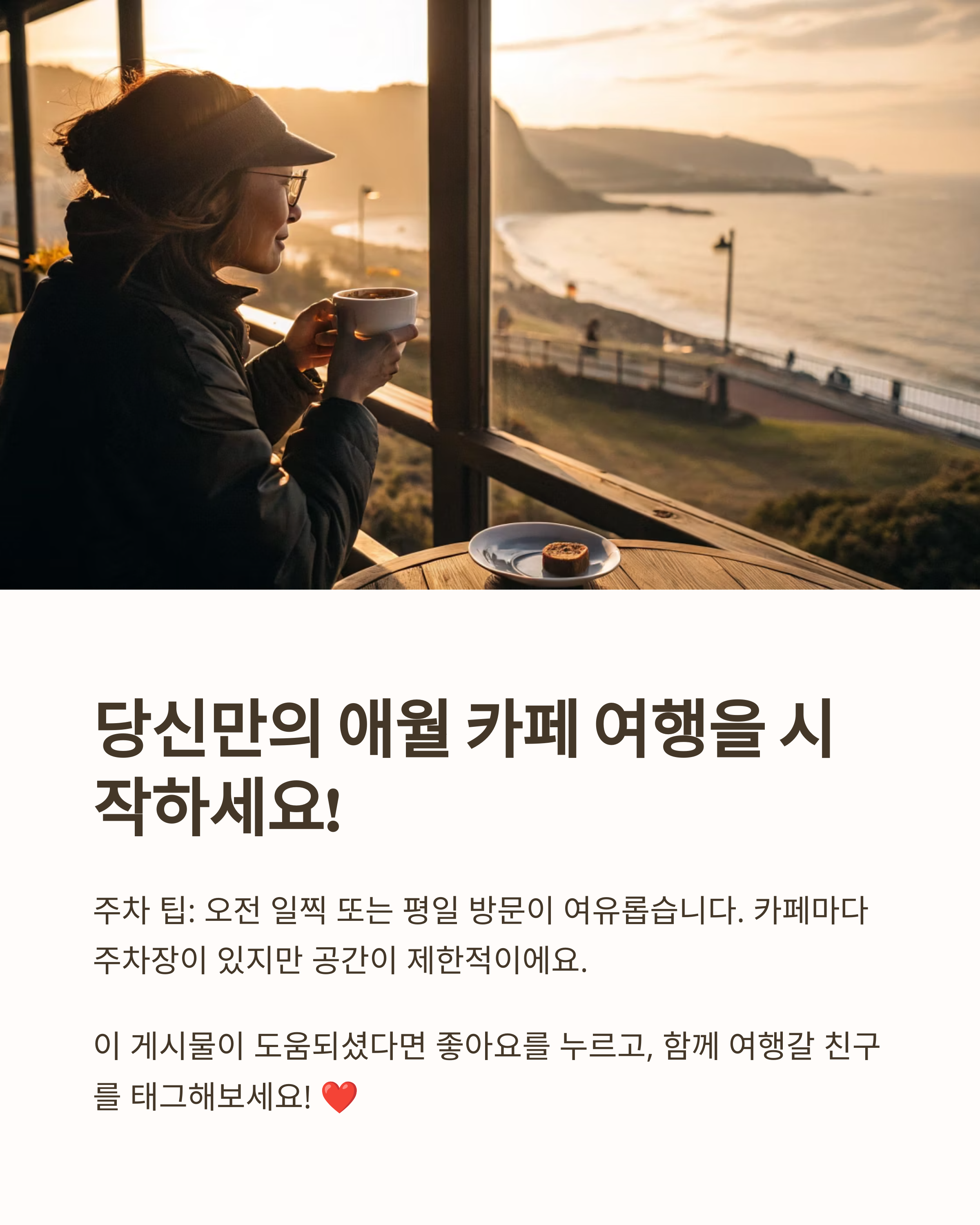 이번 글을 계기로 여러분도 애월 감성 카페 여행, 꼭 한 번 해보시길 추천드립니다. 다음 글에서는 애월 로컬 베이커리와 함께 즐길 수 있는 브런치 맛집도 소개해볼게요. 기대해주세요!
