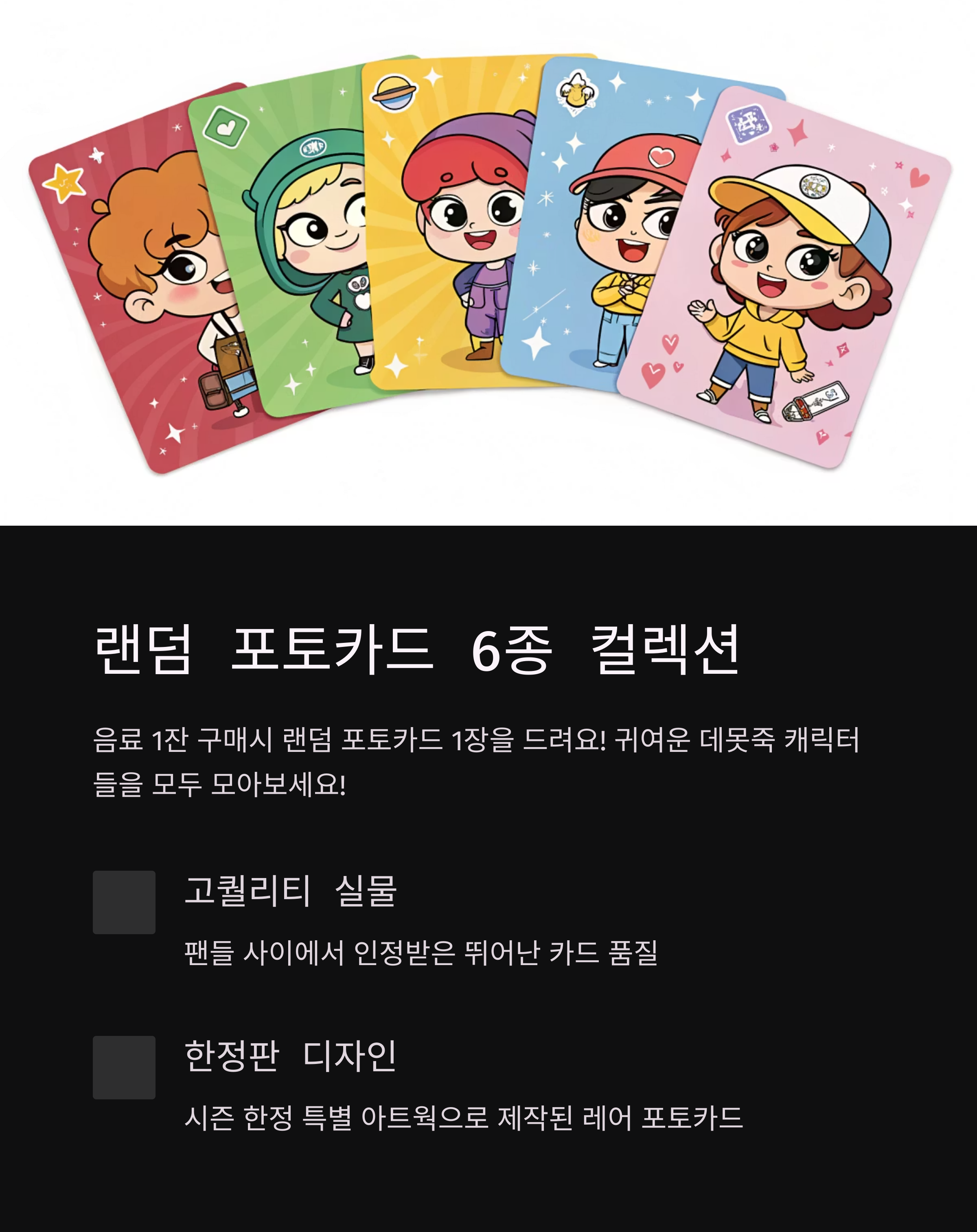 콜라보 음료 1잔 구매 시, 랜덤 포토카드 1매가 증정됩니다. 여러 잔 구매 시 중복 가능성이 있어요!