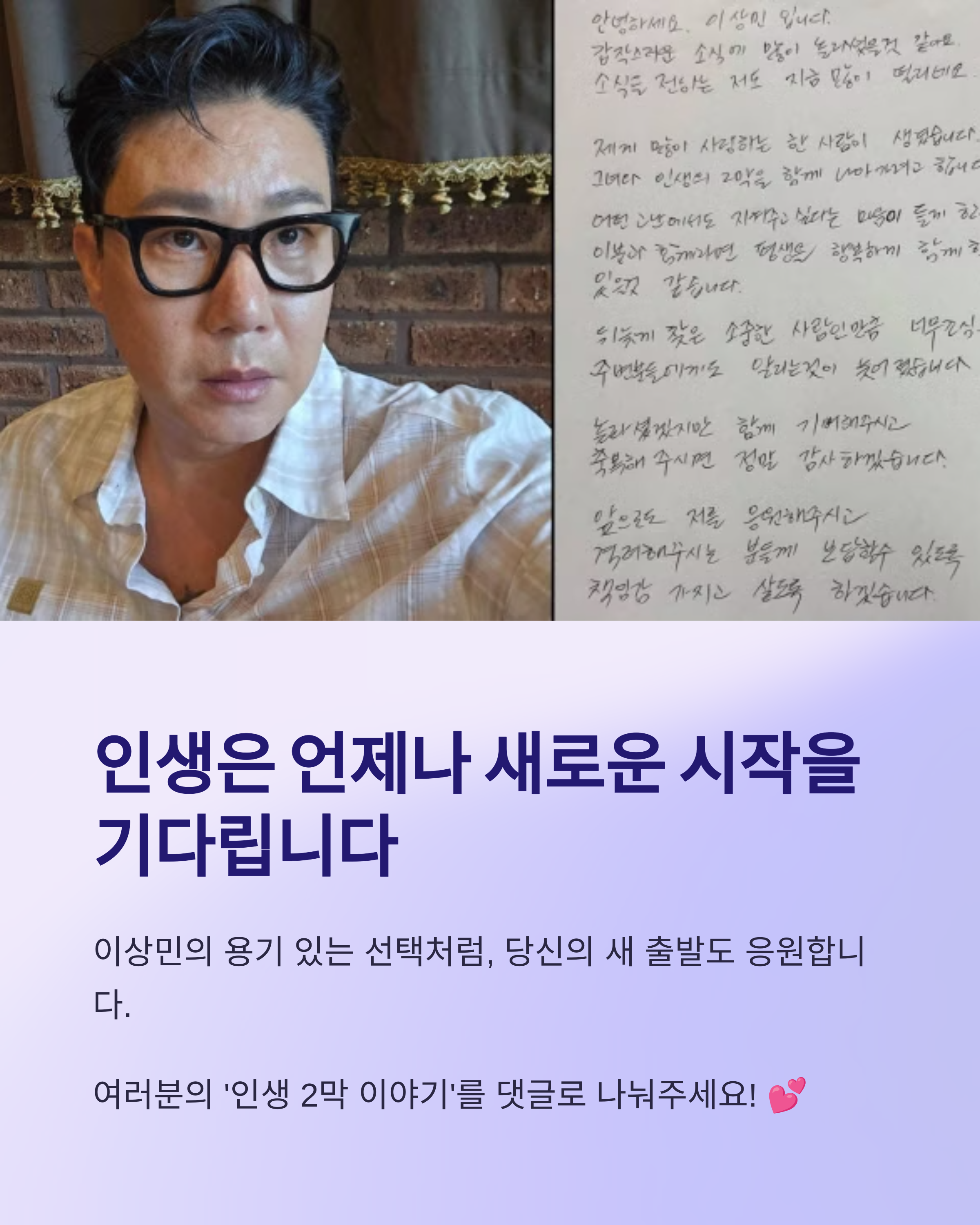 혹시 지금 인생의 전환점을 고민 중이신가요? 누군가의 두 번째 선택이 우리에게도 희망이 될 수 있습니다. 앞으로 이상민 부부의 행복을 진심으로 응원합니다.