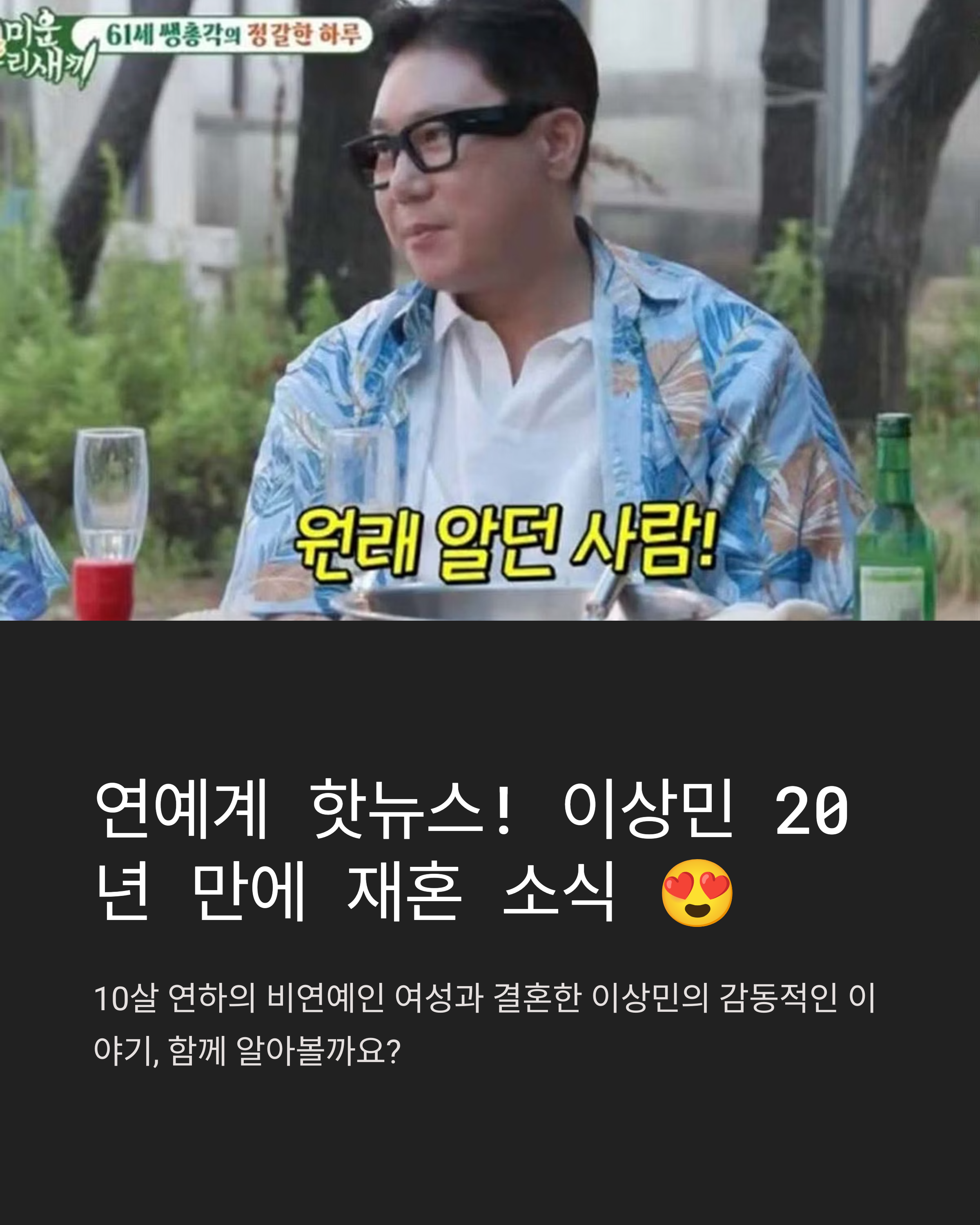 어제 뉴스를 보다가 정말 깜짝 놀랐습니다. 이상민 씨가 재혼을 발표했다는 사실, 알고 계셨나요? 무려 20년 만에 다시 사랑을 시작한 그는, SBS 예능 '미운 우리 새끼'를 통해 예비신부와의 프러포즈 장면, 혼인신고까지 공개한다고 해요. 방송 예고편만 봐도 감동이 밀려오더라고요. 이번 글에서는 그 전말을 한발 먼저 전해드릴게요!