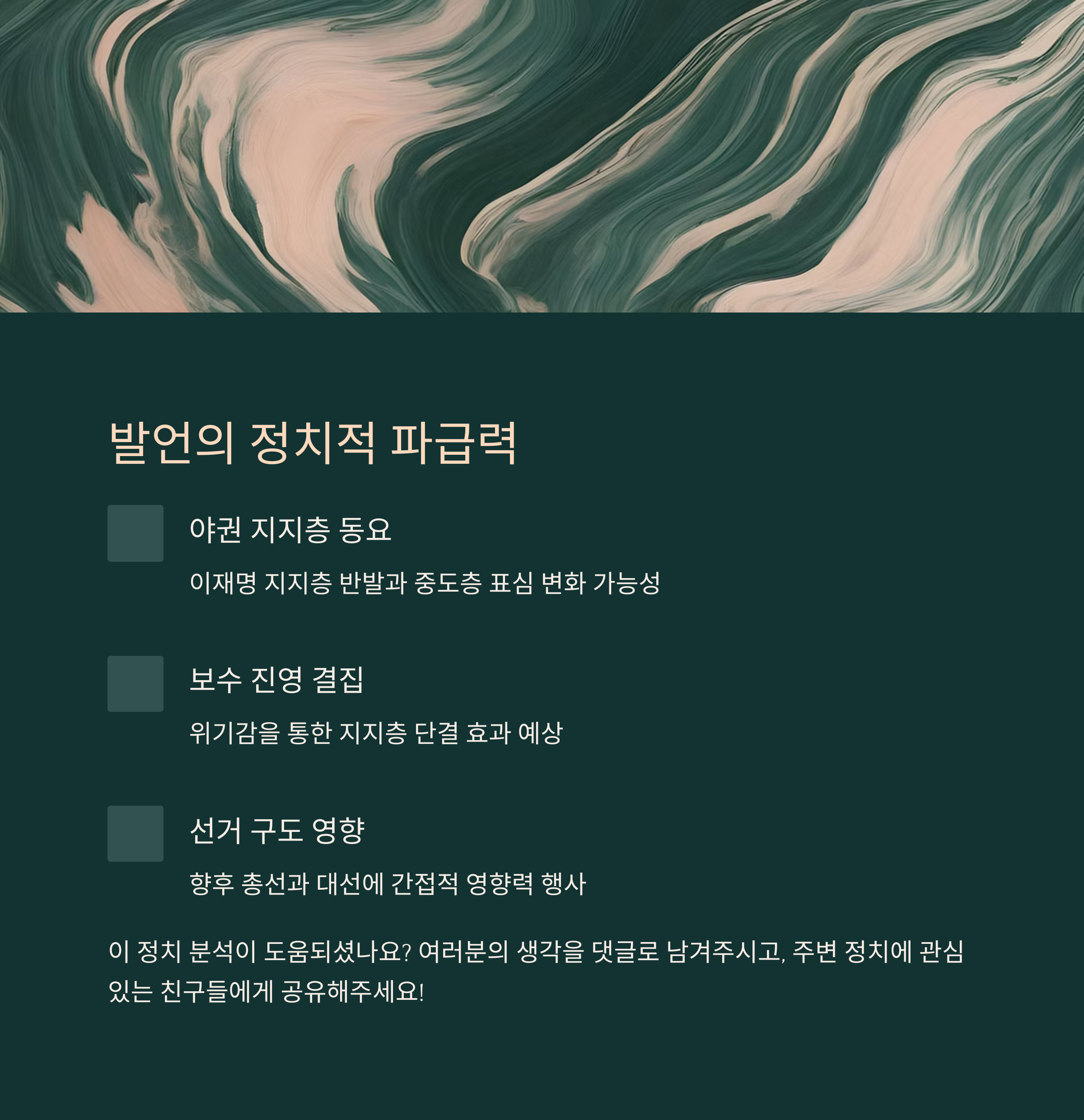 결국 이러한 발언들은 단순히 논란을 넘어, 앞으로 우리 정치의 흐름을 예측하는 중요한 단서가 될 수 있다고 생각해요. 정치라는 게 늘 이렇게 복잡하고 미묘하죠?