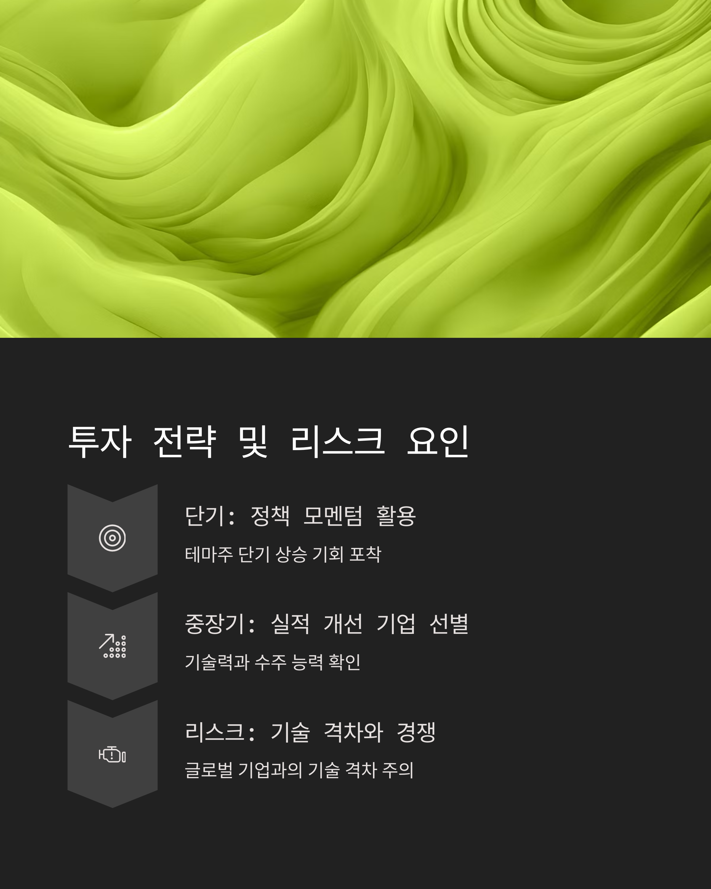 - 정책 테마는 단기성일 수 있으므로 기업 펀더멘털 확인 필수