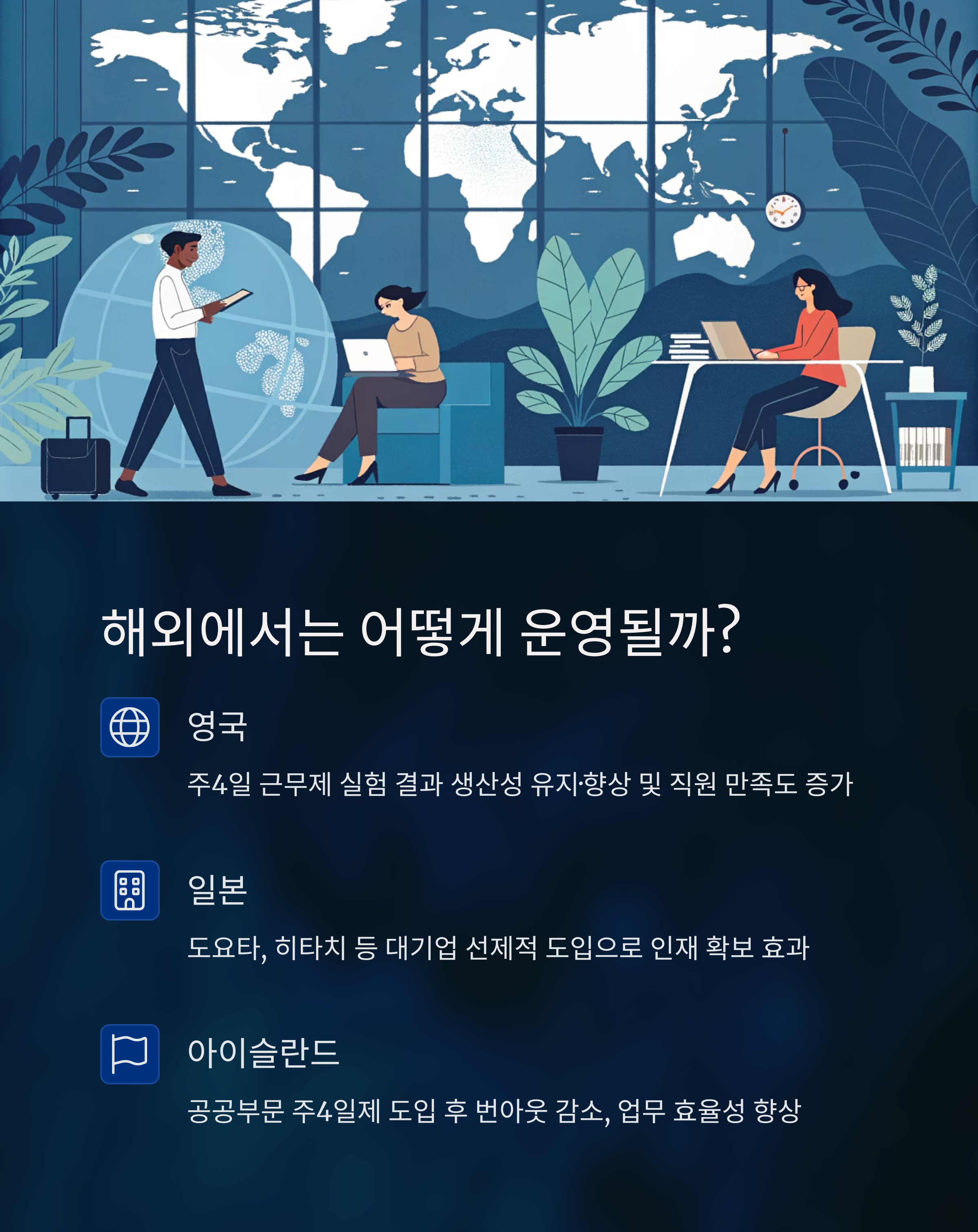 해외 사례를 보면 공통적으로 업무 효율성은 유지되거나 오히려 증가했다는 점이 인상적이에요. 특히 마이크로소프트 재팬의 사례는 많은 이들에게 충격을 줬죠. 생산성이 무려 40%나 향상됐다니!