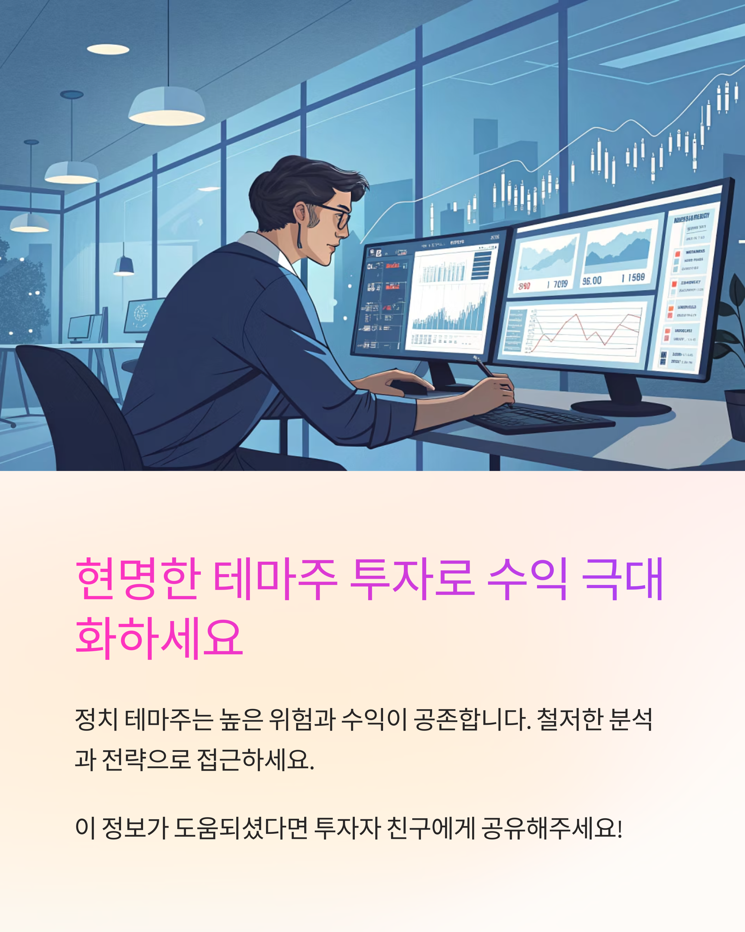 이준석 전 대표의 대선 출마 선언은 정치권뿐만 아니라 증시에도 강력한 파장을 주고 있습니다. 삼보산업, 넥스트아이, 대성창투와 같은 테마주는 앞으로도 뉴스 한 줄, 인터뷰 한 마디에 요동칠 수 있죠. 하지만 변동성 큰 시장일수록 더 냉정한 판단이 필요한 법! 이 글이 여러분의 전략적 판단에 도움이 되었길 바랍니다. 앞으로도 주요 정치 인물과 관련된 정치 테마주 분석, 계속해서 다뤄드릴게요. 즐겨찾기 등록은 선택이 아니라 생존입니다 😎