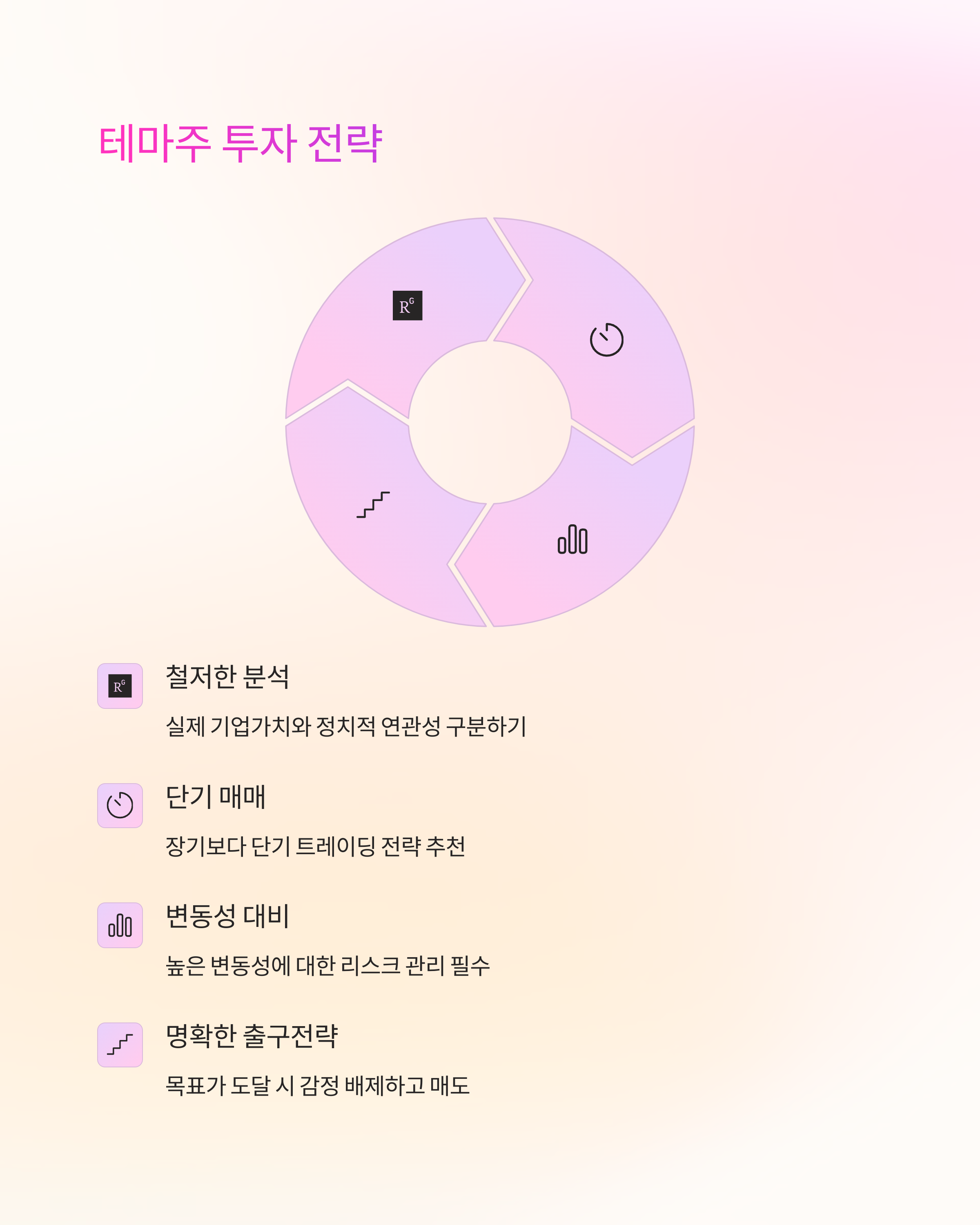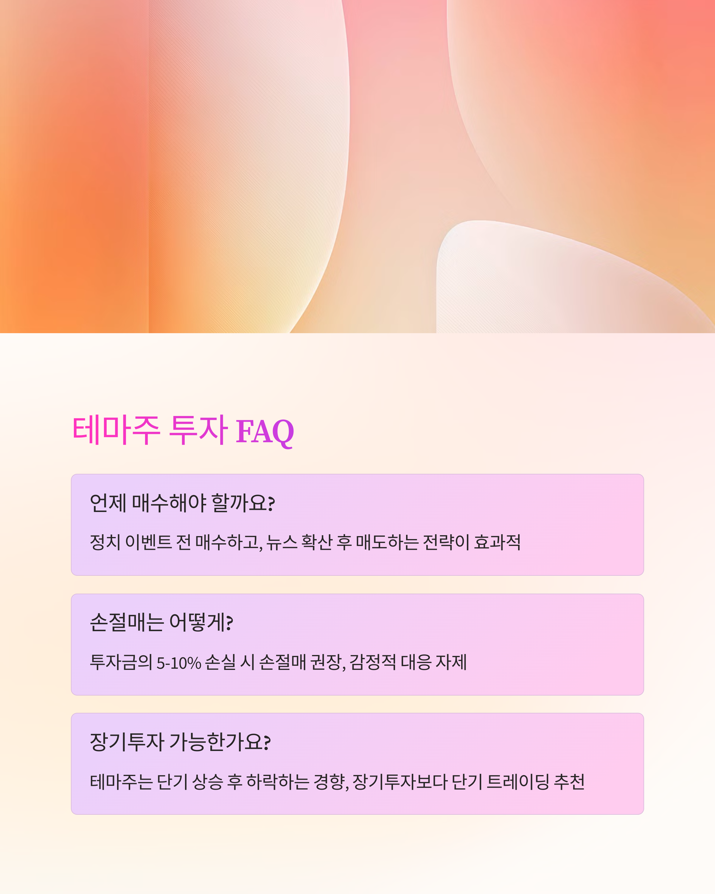 단기 테마주는 급등 후 급락 가능성이 높습니다. 기술적 지지선을 기준으로 손절 라인을 정해두거나, 거래량 감소 시 분할 매도 전략을 사용하는 게 유리합니다. 장기 보유보다는 타이밍 조절이 핵심입니다.