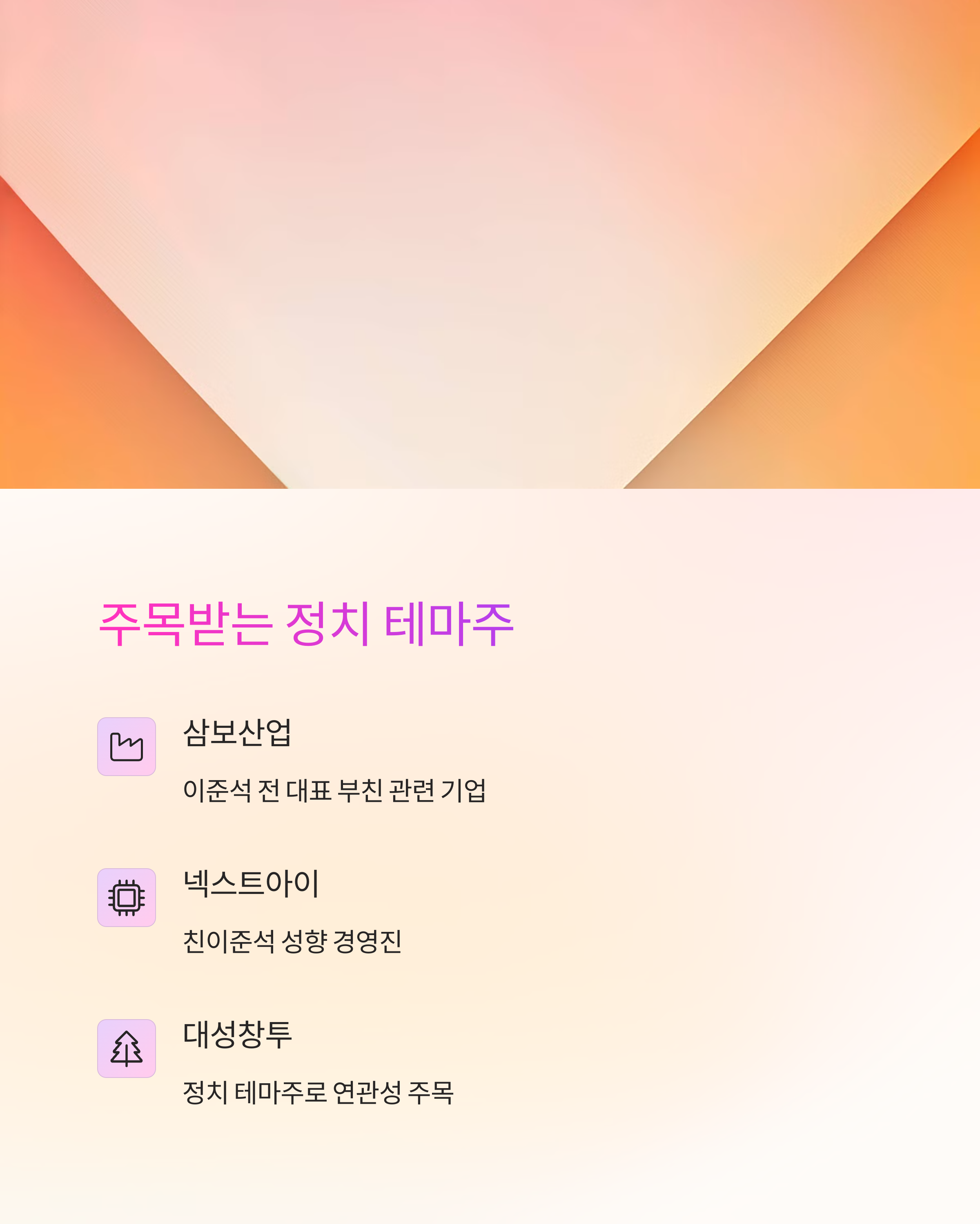 삼보산업은 이준석 전 대표의 고등학교 동문이라는 인맥 이슈로 오랜 기간 정치 테마주의 대표 종목으로 묶여 왔습니다. 직접적인 사업 연관성은 없지만, 투자자 심리에 크게 작용해 반복적으로 수급이 들어오는 특징이 있습니다.