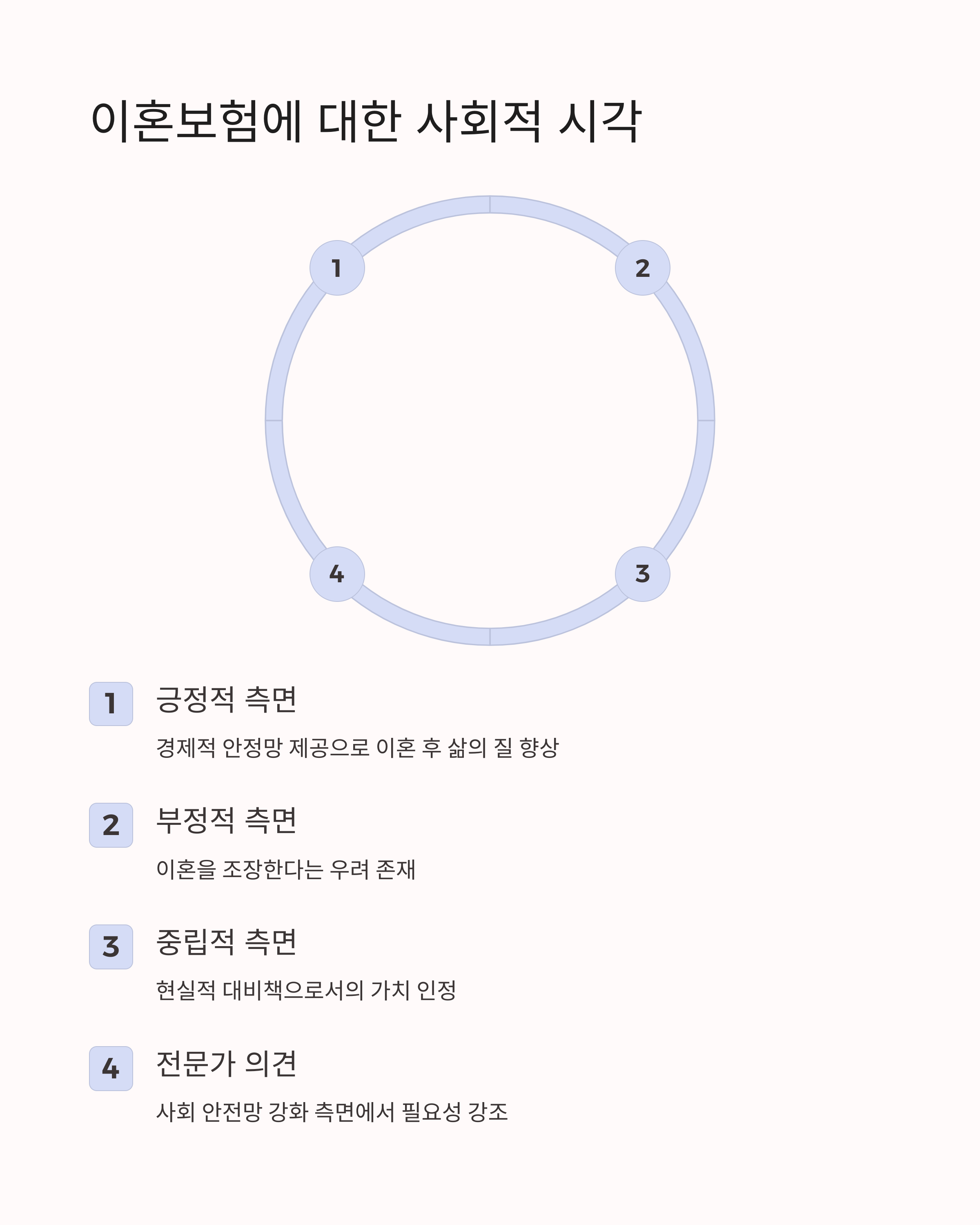 이혼보험을 두고 여전히 논쟁이 많습니다. 한편에서는 ‘현실적인 대비책’이라며 긍정적으로 보지만, 다른 한편에서는 ‘결혼 제도의 본질을 훼손한다’는 비판도 제기하죠. 다양한 시각이 공존하며, 사회적 수용도는 다음과 같이 나뉘고 있습니다.