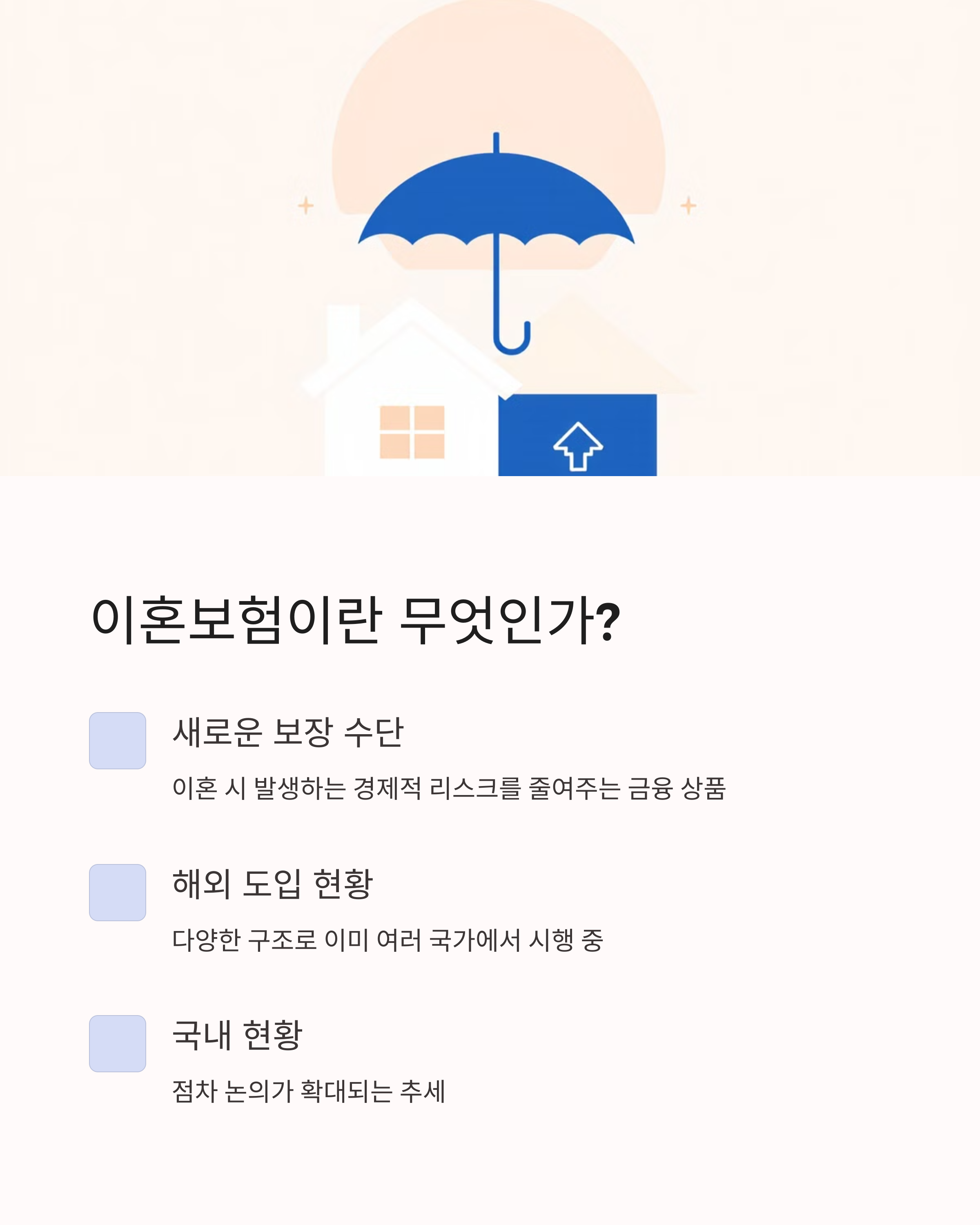 이혼보험은 말 그대로 ‘이혼’이라는 인생 이벤트에 대비하는 보험 상품입니다. 사망보험이나 암보험처럼 갑작스럽고 심각한 상황에 대비하듯, 이혼이라는 관계 단절 후 발생할 수 있는 경제적 리스크와 생활비 문제를 커버해 주는 게 핵심이죠. 실제로 미국, 독일, 일본 등에서는 이미 실험적인 형태로 운용되고 있으며, 국내에도 유사한 컨셉의 보장성 특약 상품이 점점 늘어나고 있는 추세입니다. 초기에는 ‘결혼 실패를 예상하는 보험’이라는 비판도 있었지만, 요즘은 그보다 현실적인 삶의 대비책으로 점점 받아들여지고 있습니다.