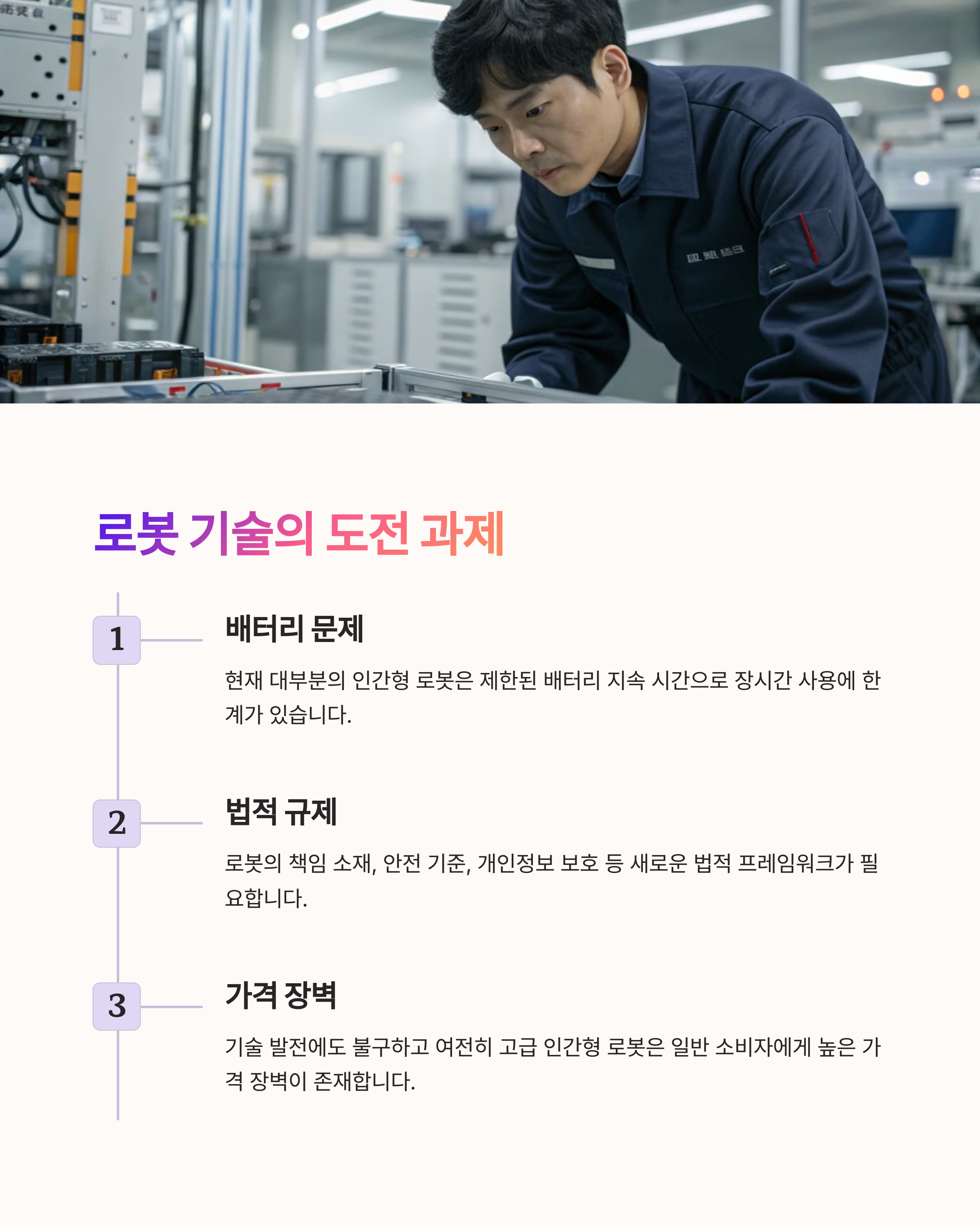 하지만 아직 해결해야 할 과제들도 많습니다. 배터리 지속 시간, 가격 문제, 법적·윤리적 이슈 등 다양한 요소들이 남아 있지만, 기술이 지속적으로 발전하면서 이러한 문제들은 점차 해결될 것입니다. 앞으로 인간과 로봇이 조화를 이루며 살아가는 사회가 더욱 가까워지고 있습니다.
