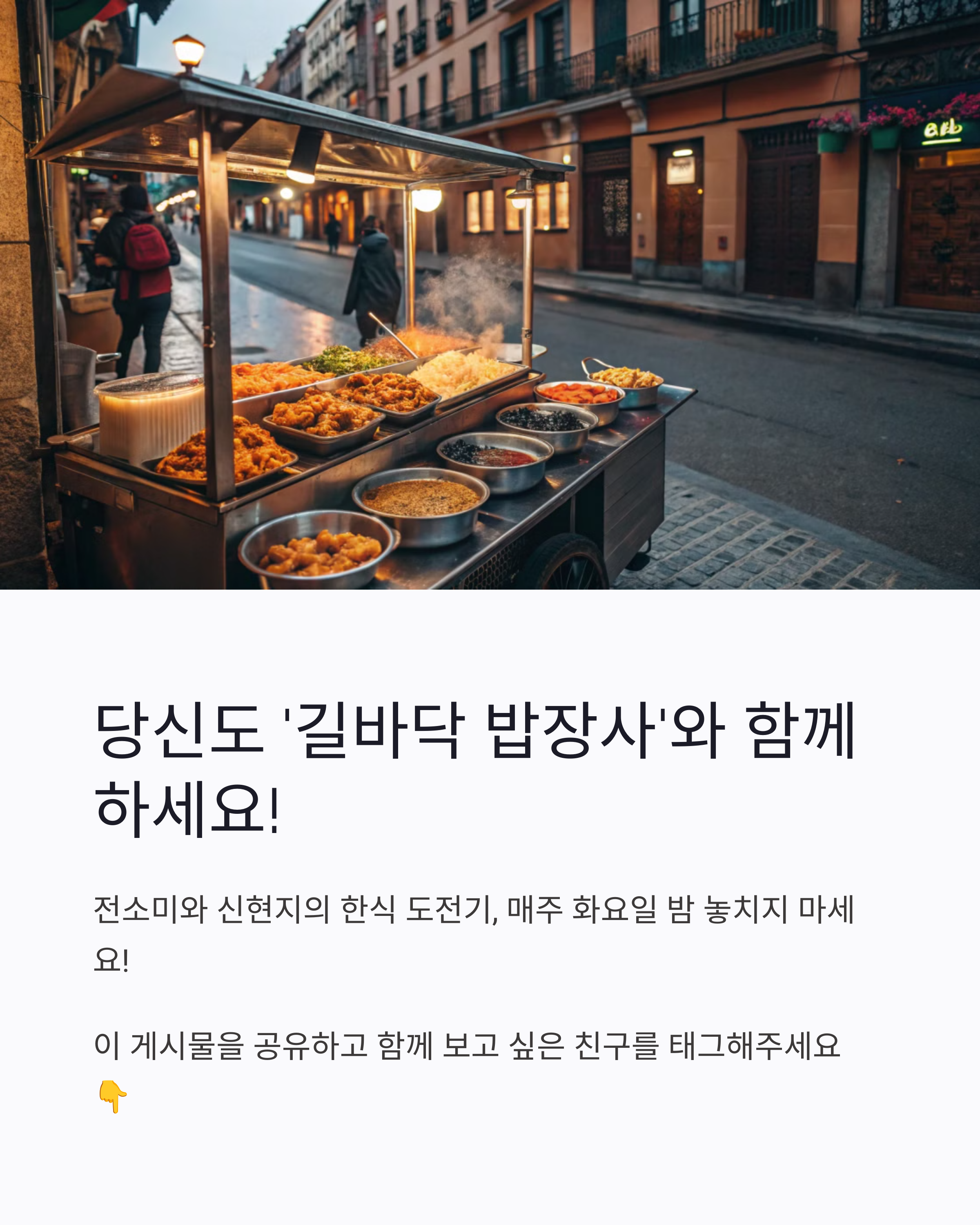 ‘길바닥 밥장사’는 단순한 먹방 예능이 아니라, 리얼함과 케미, 현지 문화의 접점까지 담아낸 새로운 스타일의 화요일 예능이에요. 전소미와 신현지의 의외의 조합, 스페인 길거리에서 펼쳐지는 메뉴 개발과 장사 대결, 모든 게 신선하고 웃음도 있어요. 아직 못 보셨다면 이번 주 방송부터 한번 시작해보세요. 한입 웃고 한입 감탄하게 될지도 몰라요!