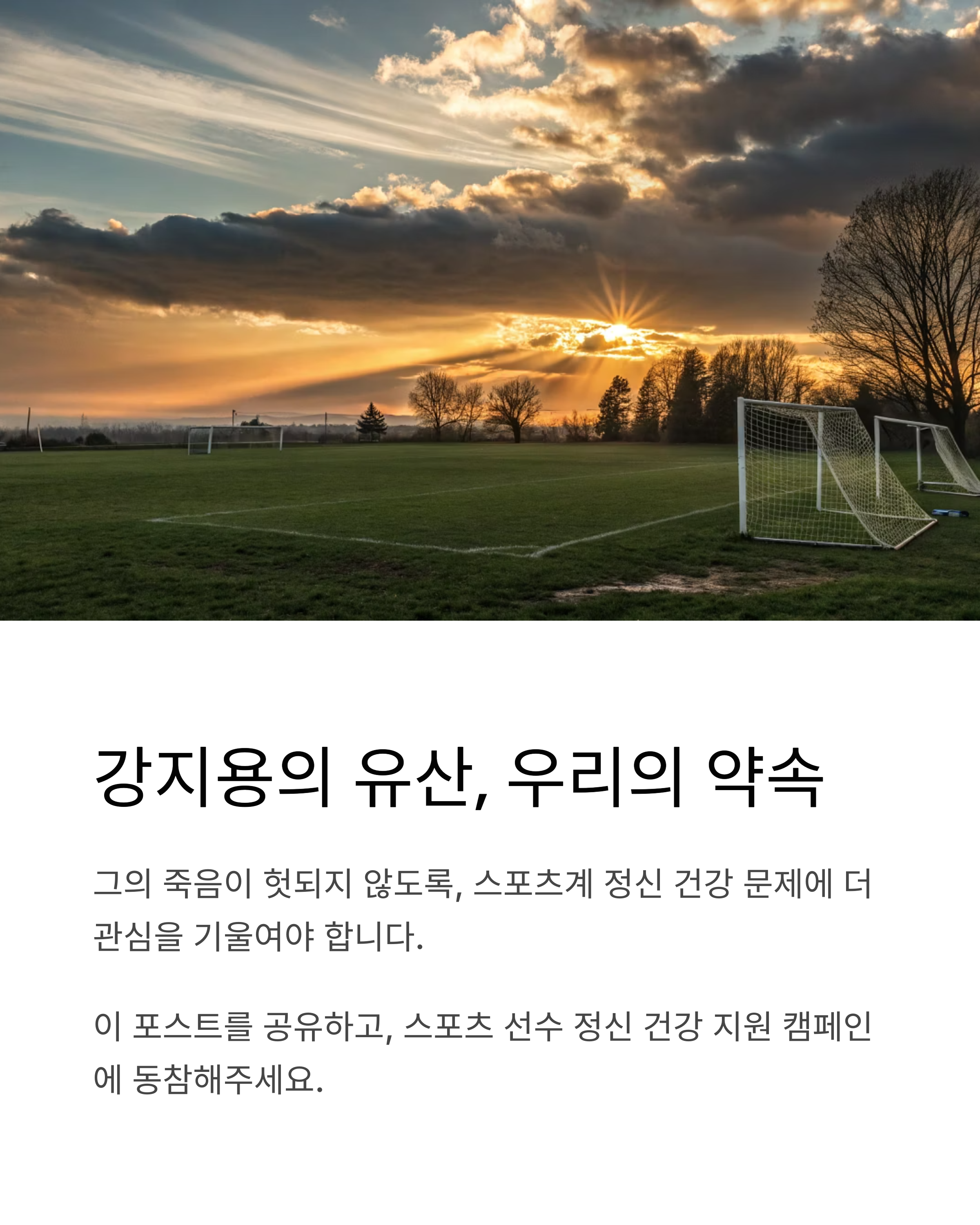 앞으로도 스포츠계의 정신 건강 이슈에 대한 지속적인 관심과 후속 포스팅으로, 더 많은 이야기를 함께 나눠볼 예정입니다. 강지용 선수가 남긴 따뜻한 흔적을 오래도록 기억하며, 그가 바랐던 세상이 조금씩 이뤄지기를 진심으로 바랍니다.
