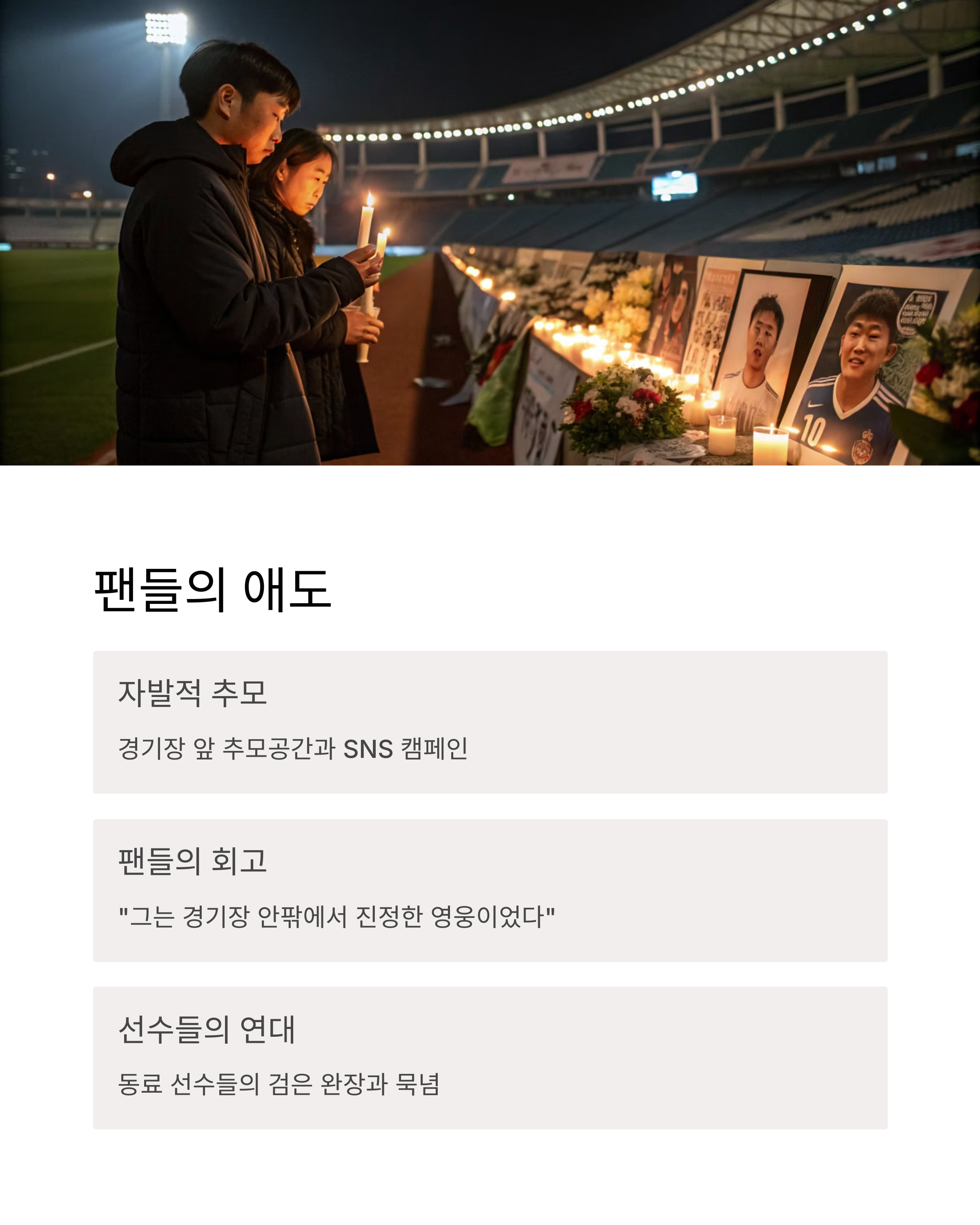 강지용 선수의 비보가 전해진 직후, 국내 축구 커뮤니티는 물론 SNS와 각 구단 홈페이지에는 추모 메시지가 잇따랐습니다. 아래는 주요 반응을 정리한 리스트입니다.