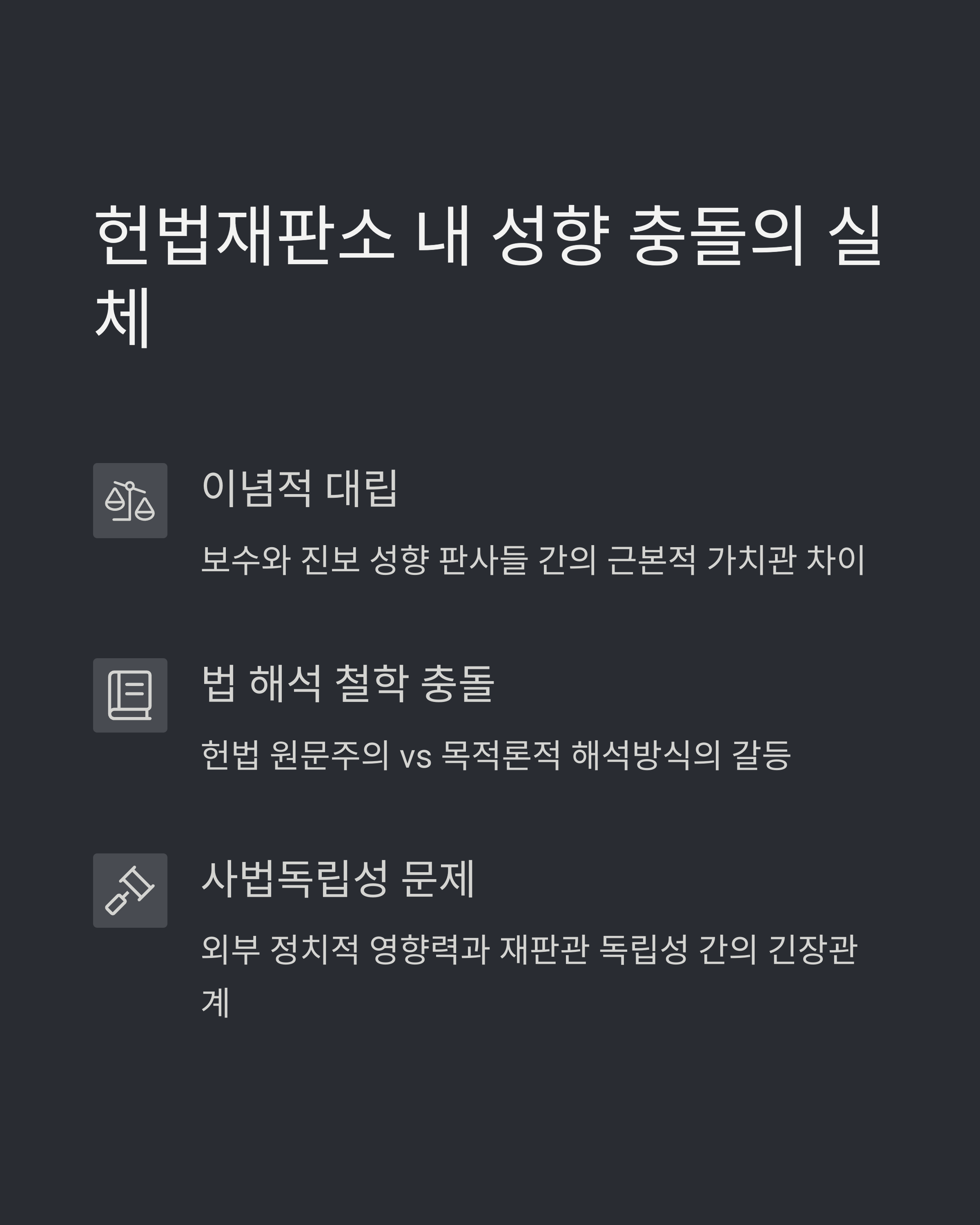 헌재는 외부 갈등이 드러나는 경우가 드뭅니다. 이번처럼 의견 충돌이 정치적으로 비치는 상황은 매우 이례적이에요.