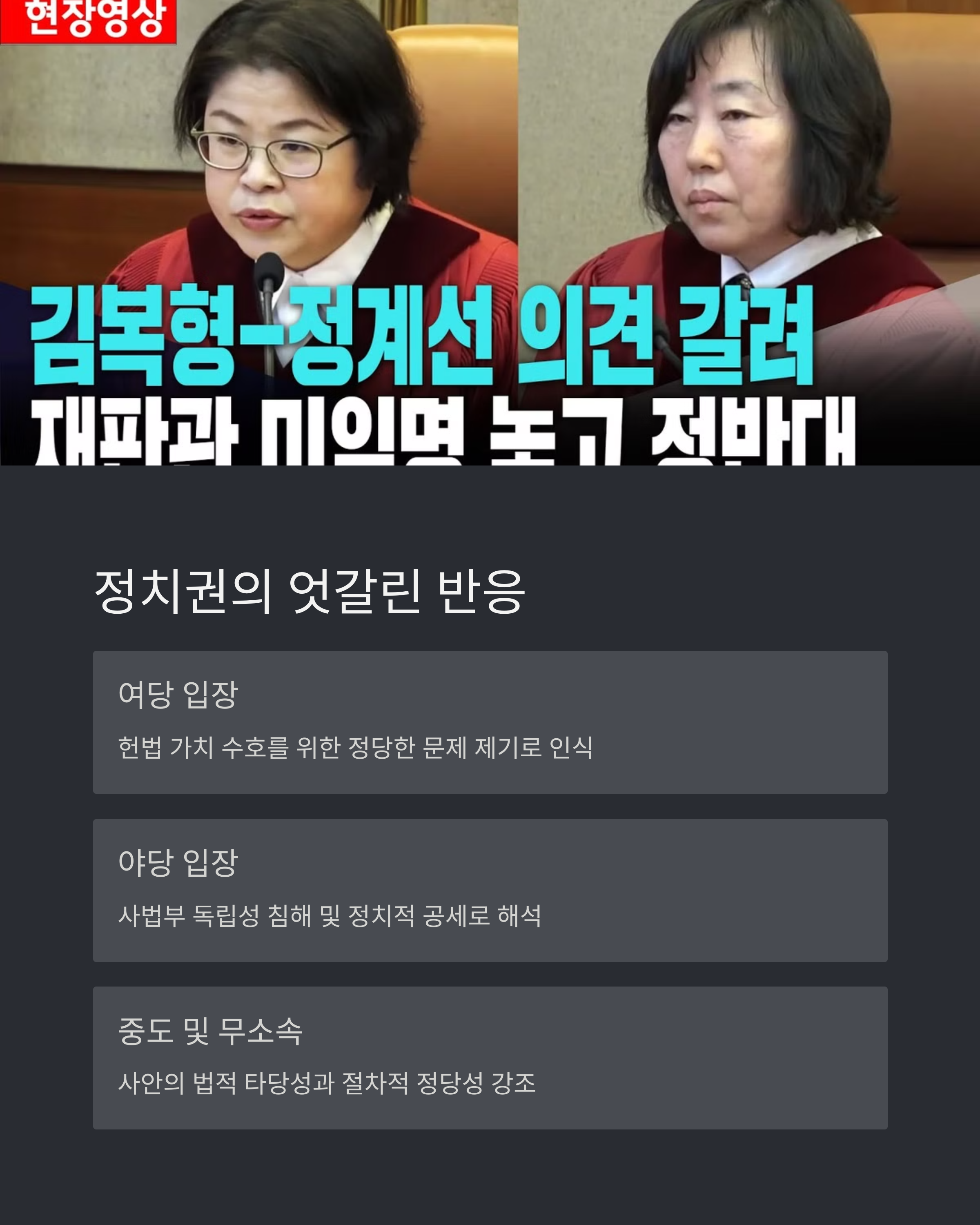 특히 정 재판관이 참여했던 소수 의견의 법리 구조를 두고 “정치적 가치에 편향될 우려가 있다”는 취지의 발언은, 헌재 내부 구성원 사이에서도 직접적인 도전으로 해석됐습니다.