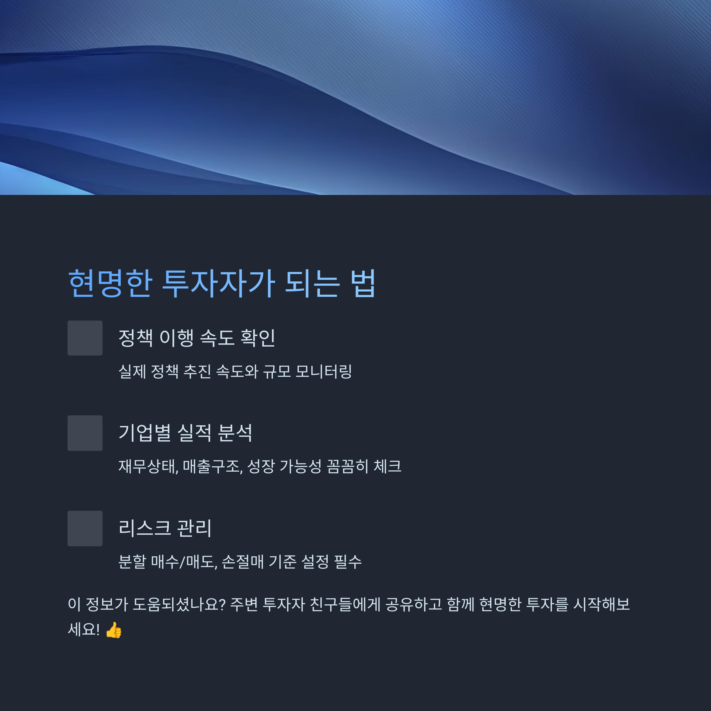 - 신중한 투자: 정책 이행 여부와 기업별 실적을 꼼꼼히 확인하고, 리스크 관리를 철저히 해야 합니다.