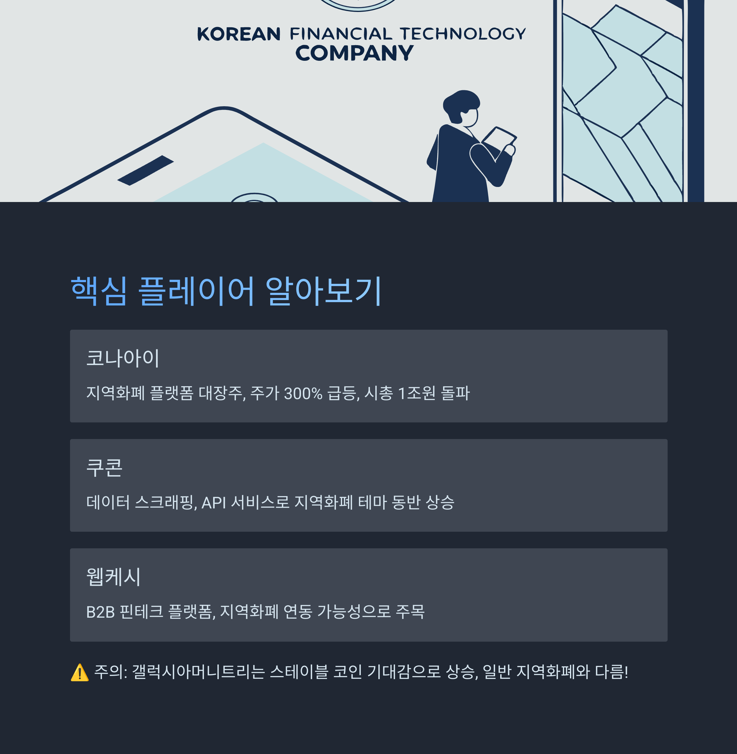 | 코나아이 (Kona-I) | 지역화폐 플랫폼 운영, IC카드 제조 | 대장주 역할, 주가 300% 이상 급등, 시총 1조원 돌파 |