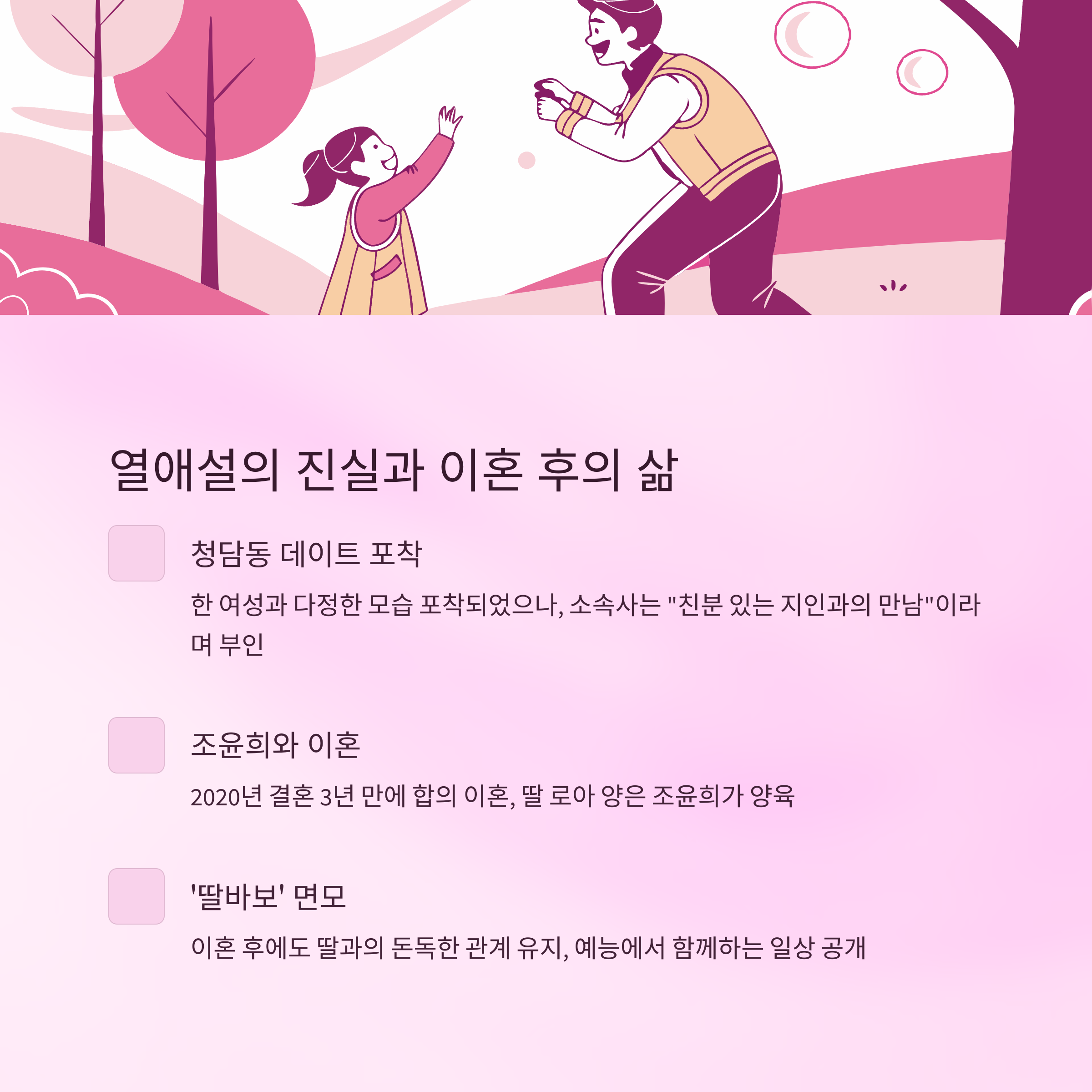 | 이혼 후 근황 | 방송 출연, 딸과의 행복한 일상 공개 등 |