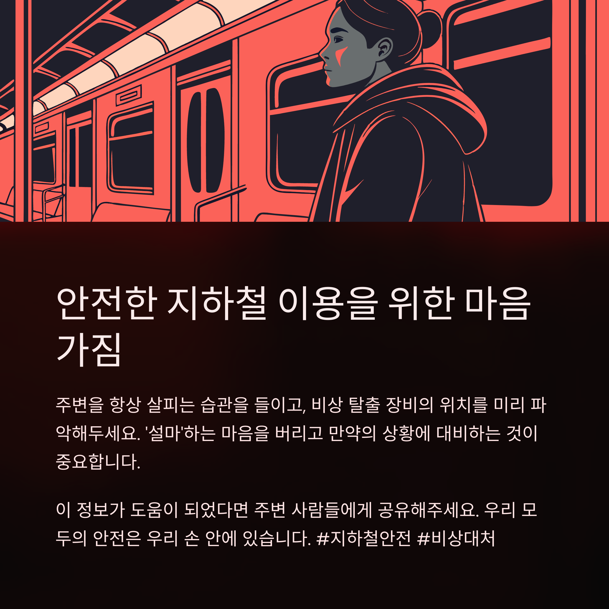끔찍한 지하철 방화 사건은 우리에게 비상시 대처의 중요성을 일깨워주었습니다. 침착한 대응과 사전 지식은 나의 안전뿐 아니라 다른 사람들의 생명을 지키는 데도 큰 도움이 됩니다. 오늘 알려드린 수칙들을 꼭 기억하고, 모두가 안심하고 이용할 수 있는 지하철을 만들어나가요!