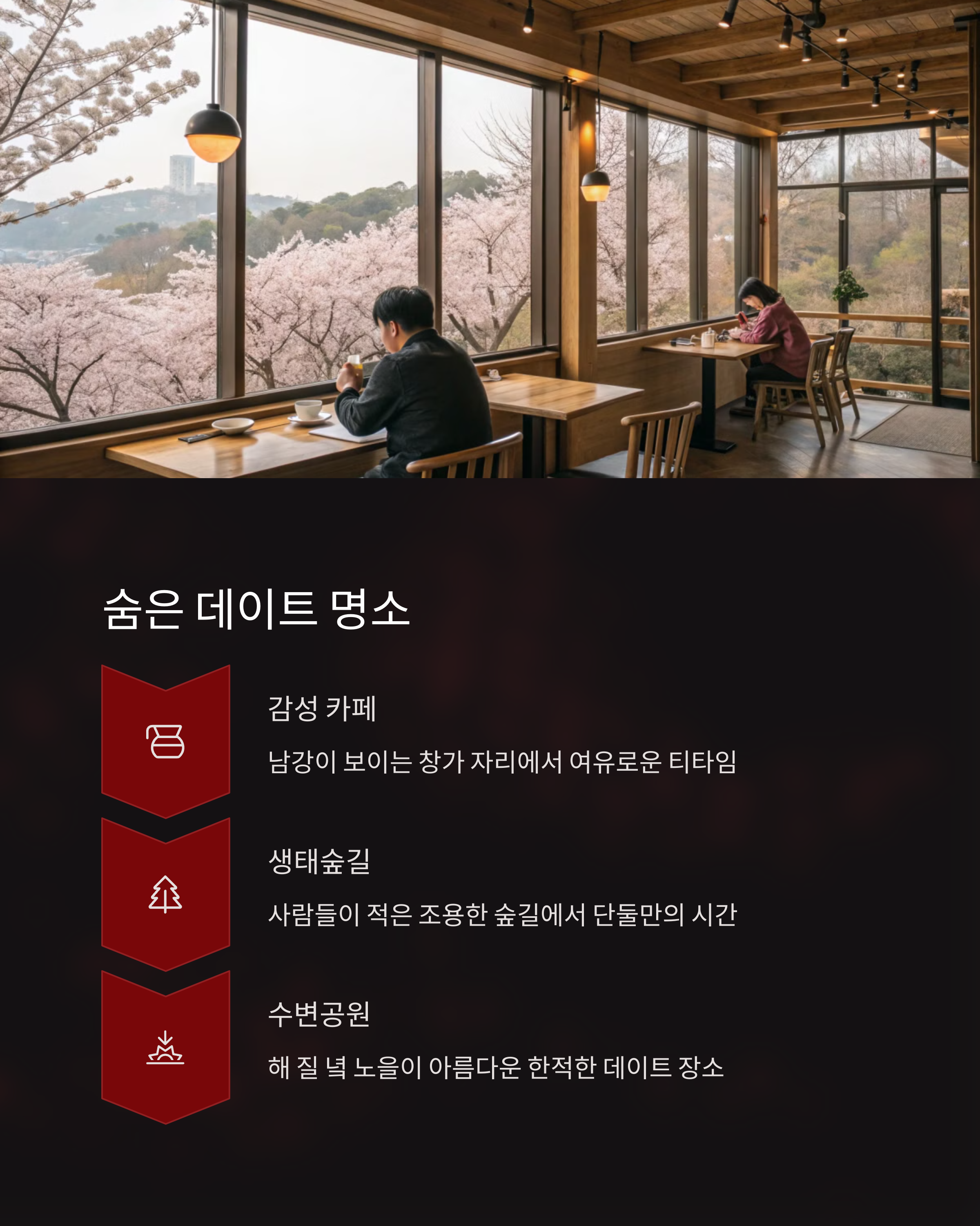 봄이면 벚꽃이 흩날리는 강변길이 펼쳐져 연인들의 데이트 코스로도 인기가 많고, 해 질 무렵 노을과 함께 즐기는 산책은 하루의 피로를 말끔히 씻어줍니다.