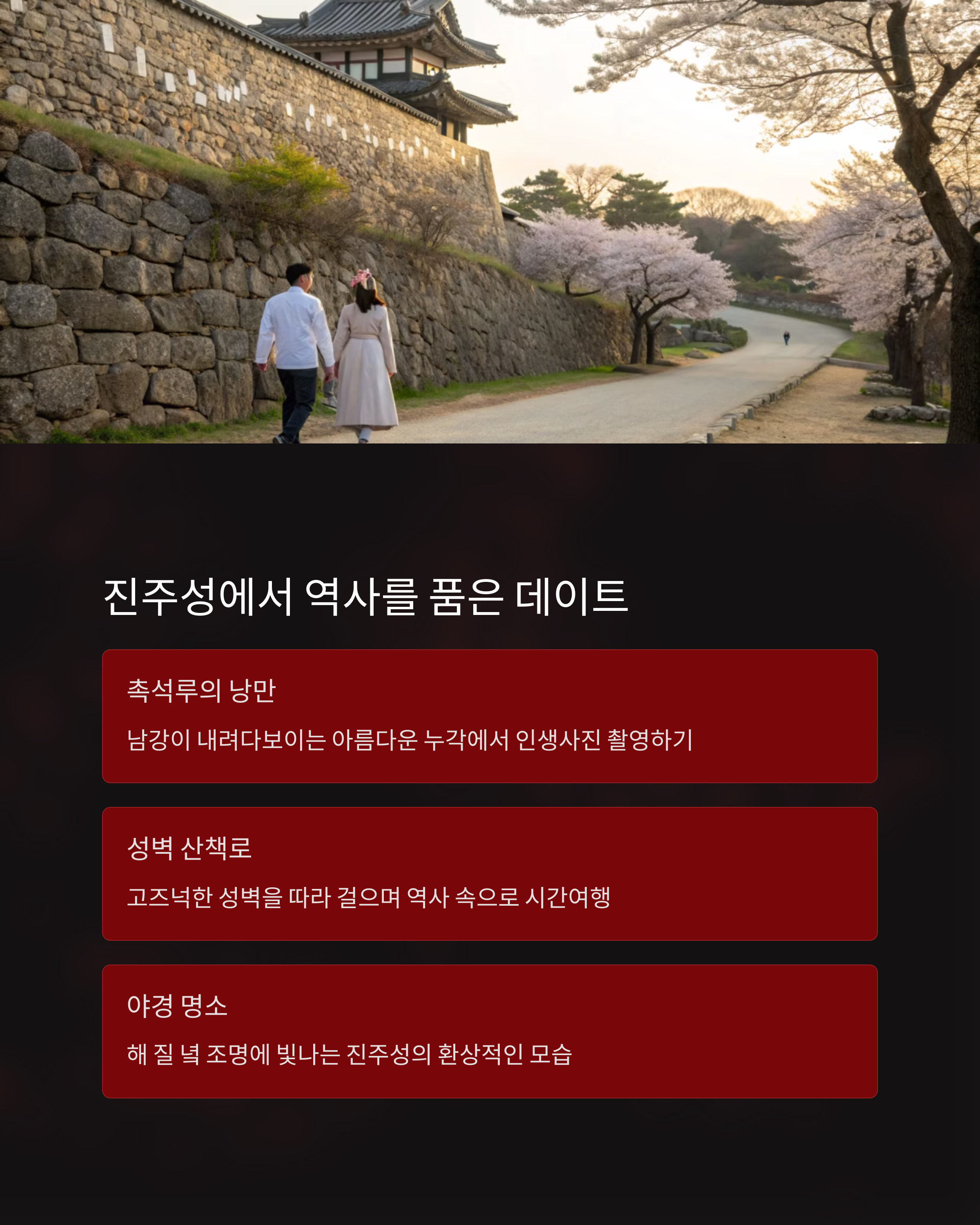 진주는 생각보다 넓지 않아 하루나 1박 2일 여행 코스로도 충분해요. 추천 이동 루트를 참고해보세요.