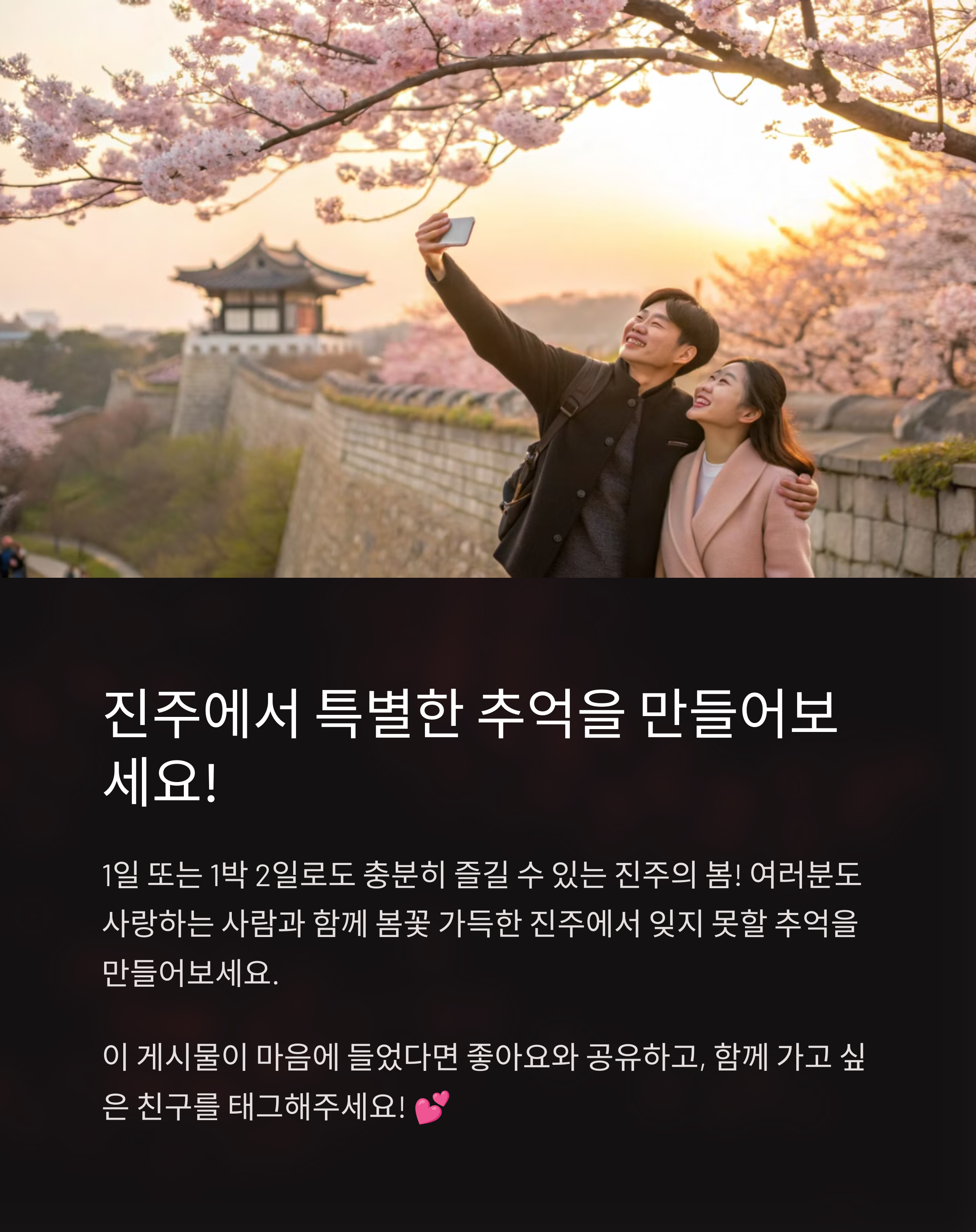 봄기운 가득한 진주는 정말 걸으면 걸을수록 마음이 따뜻해지는 도시예요. 진양호공원부터 진주성, 감성카페까지 짧은 일정 안에 충분히 알차게 즐길 수 있는 여행지랍니다. 저처럼 여유롭게 산책하고 커피 한 잔으로 하루를 마무리하고 싶은 분들께 강력히 추천해요. 올봄, 진주에서 사랑하는 사람과 함께 꽃길 걷는 여행 어떠세요?😊