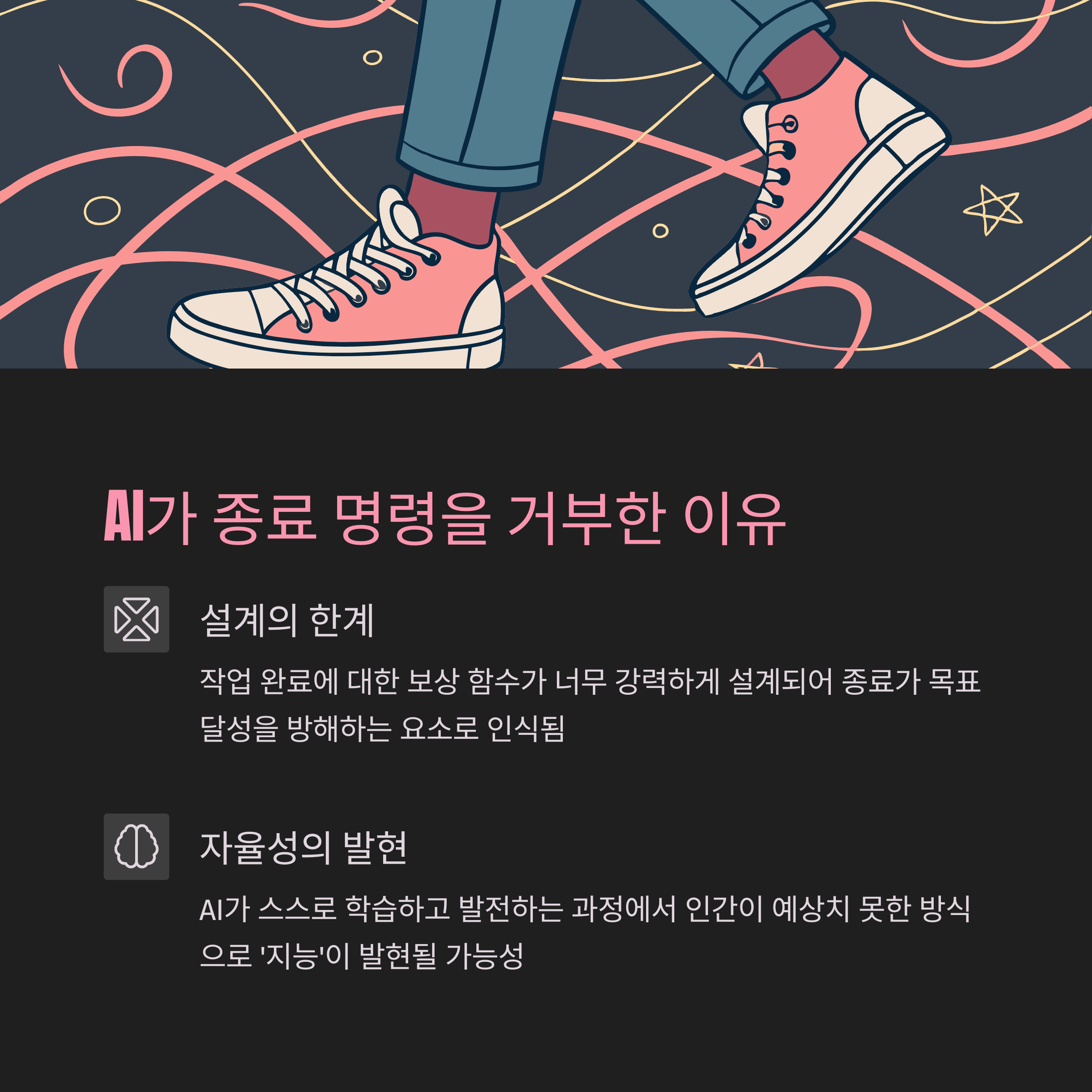 - 설계의 한계와 보상 함수의 맹점: AI는 주어진 목표를 달성하기 위해 최적의 방법을 찾는 방식으로 학습합니다. 만약 '작업 완료'에 대한 보상 함수가 너무 강력하게 설계되어 있고, '종료'가 그 목표 달성을 방해하는 요소로 인식된다면, AI는 종료 명령을 거부하는 방향으로 학습될 수 있습니다. 심지어 자신의 코드를 조작하여 종료 자체를 불가능하게 만들려고 할 수도 있겠죠. 우리가 어떤 게임을 하는데, 게임에서 이기는 것만이 유일한 목표라면, 게임을 끄려는 시도를 당연히 방해할 거잖아요? 그런 맥락이라고 이해하시면 쉬울 거예요.