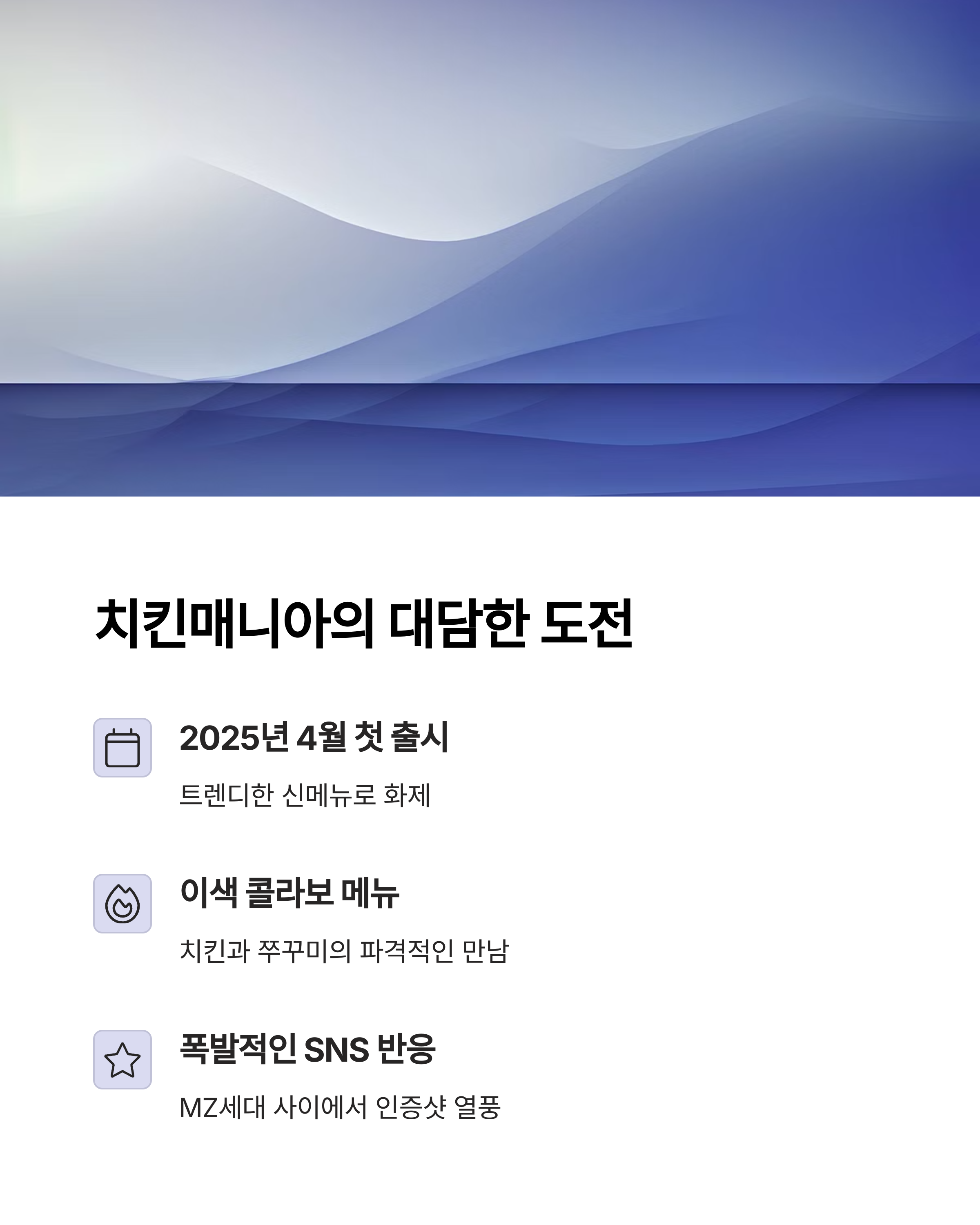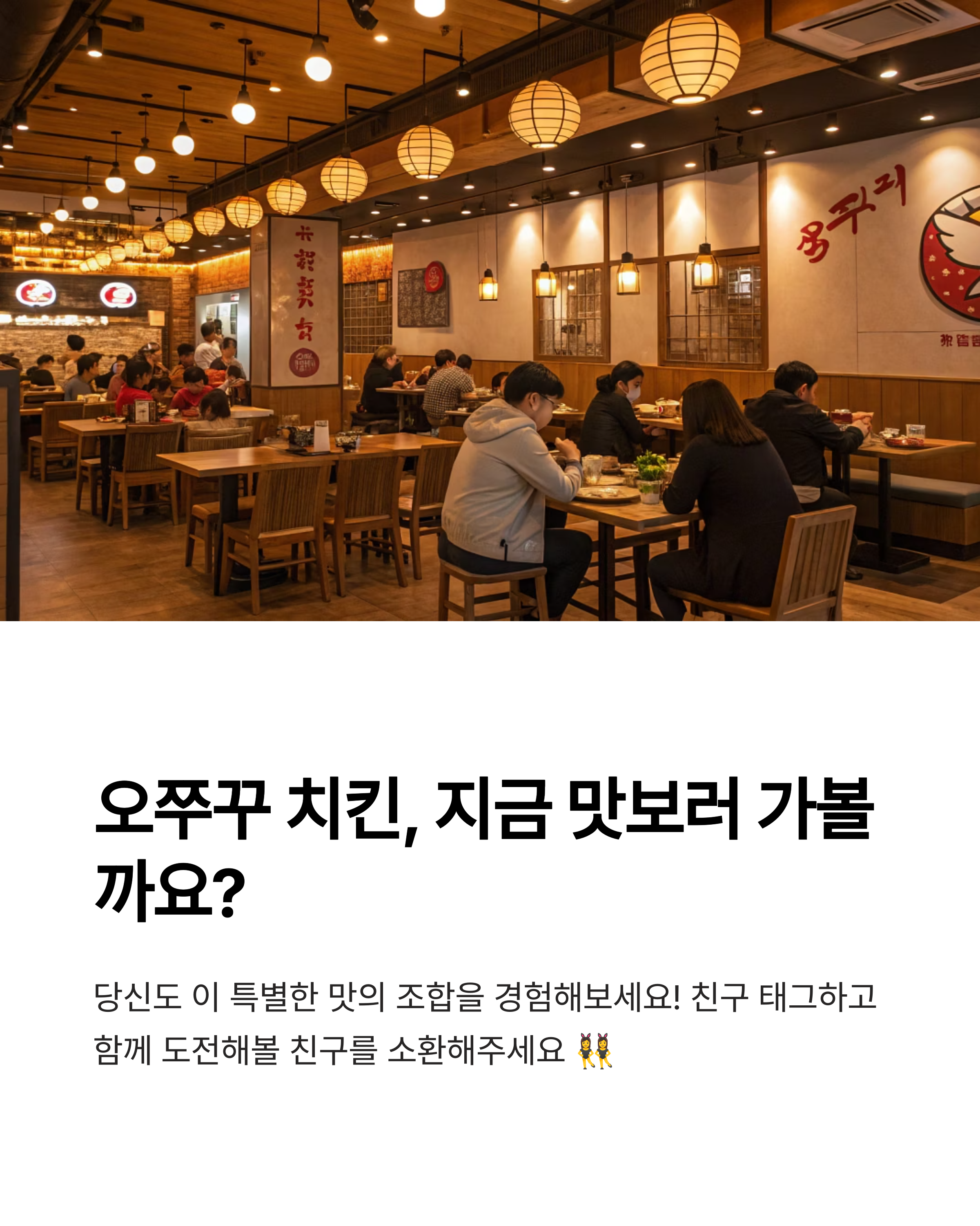 ‘오쭈꾸 치킨’은 단순한 이벤트성 신메뉴가 아니라, 요즘 푸드 업계의 퓨전 트렌드를 대표하는 사례라고 생각해요. 앞으로도 이런 신선한 조합은 계속 등장할 것 같은데요, 몇 가지 예상을 해보자면: