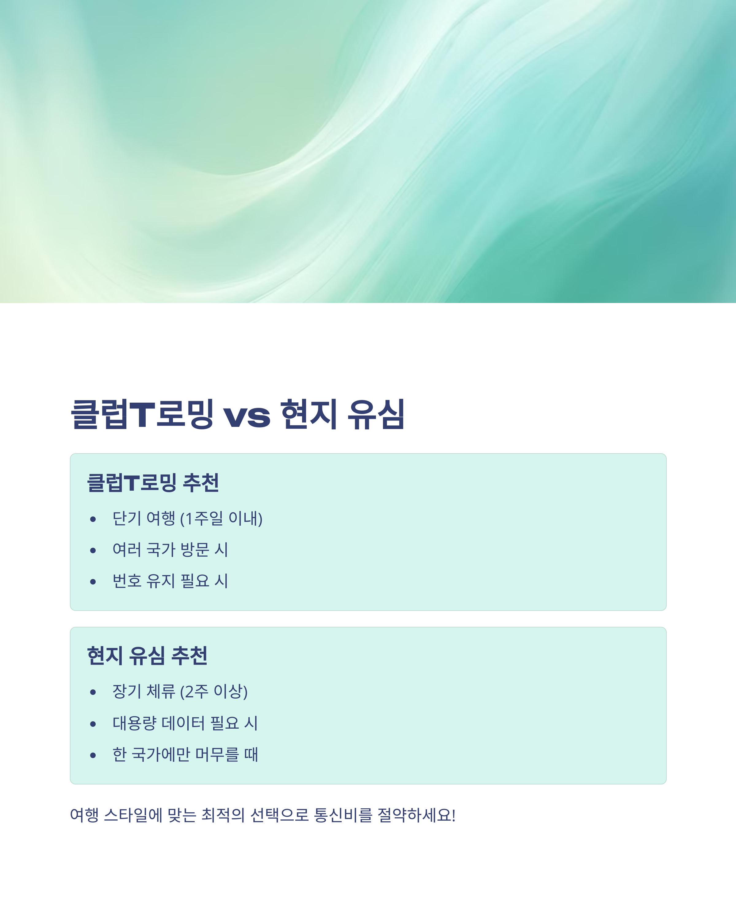 짧은 여행(1~7일)의 경우 클럽T로밍이 편리하고 경제적입니다. 반면, 장기 체류(2주 이상)라면 현지 유심이 더 저렴할 수 있습니다.