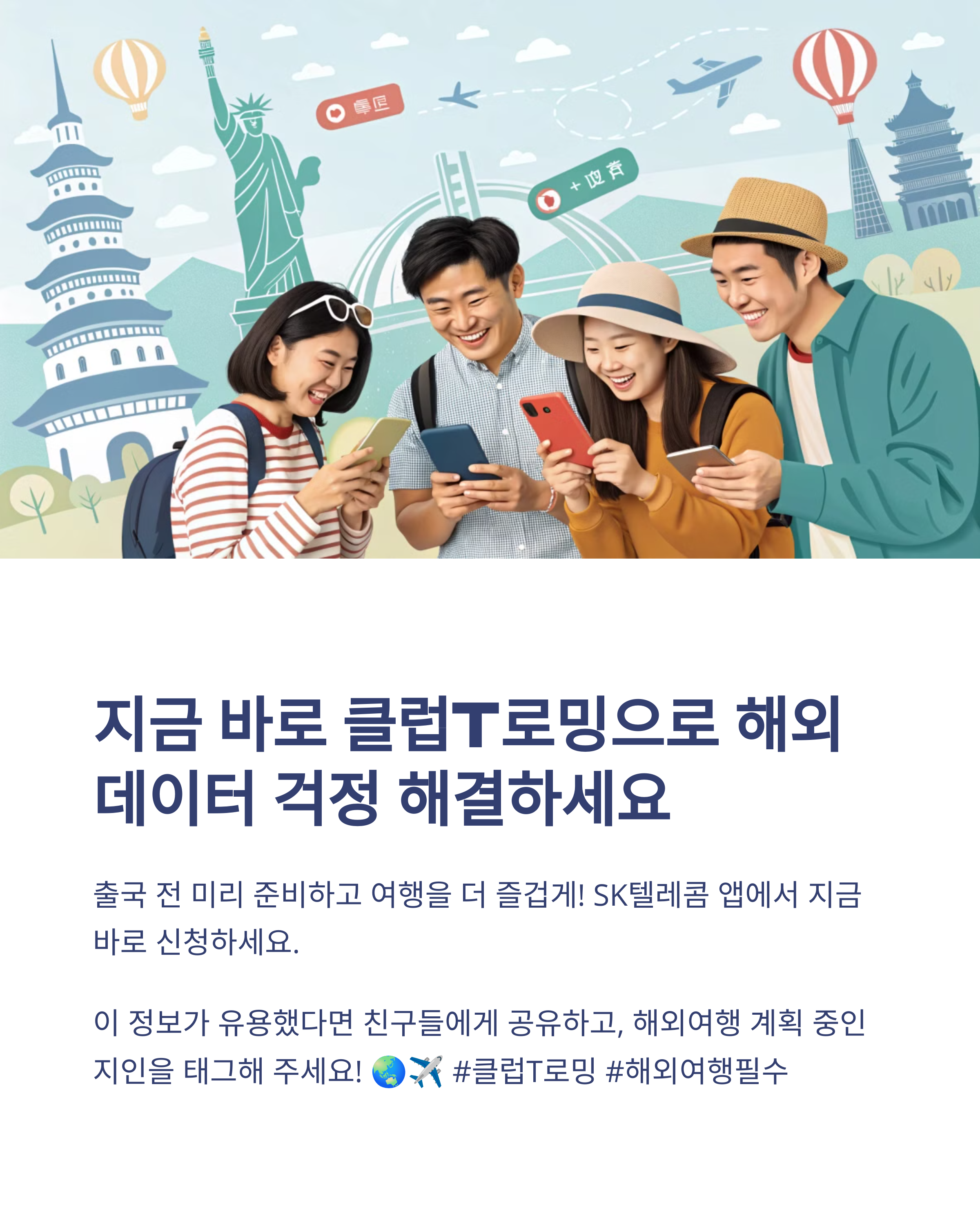 해외에서도 끊김 없는 데이터 사용을 원한다면 클럽T로밍을 고려해보세요! 여러분의 경험이나 궁금한 점이 있다면 댓글로 공유해 주세요. 😊