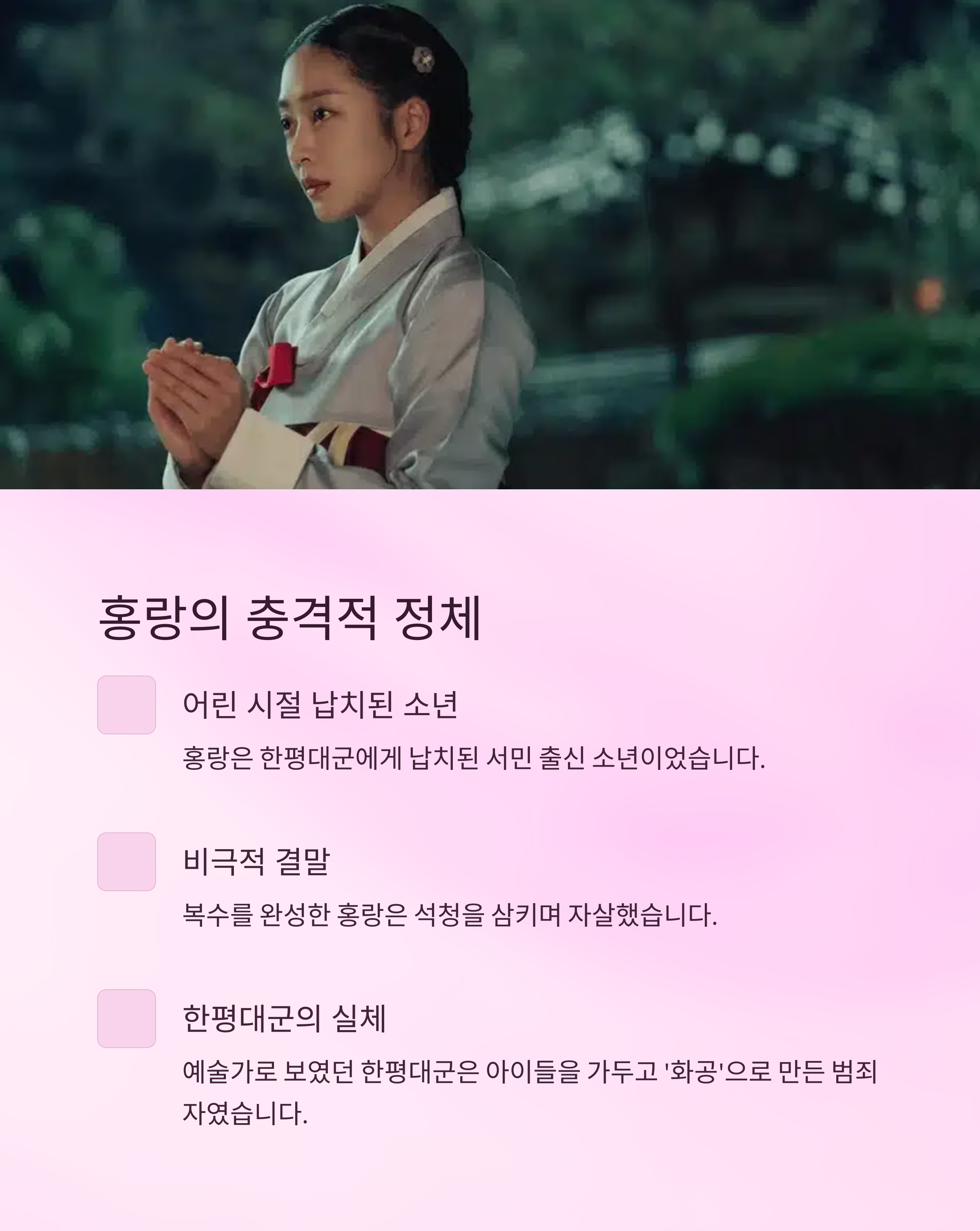 어린 시절 인신매매된 후 홍랑으로 길러진 인물입니다. 원래의 '홍랑'은 따로 존재했을 가능성도 있죠.