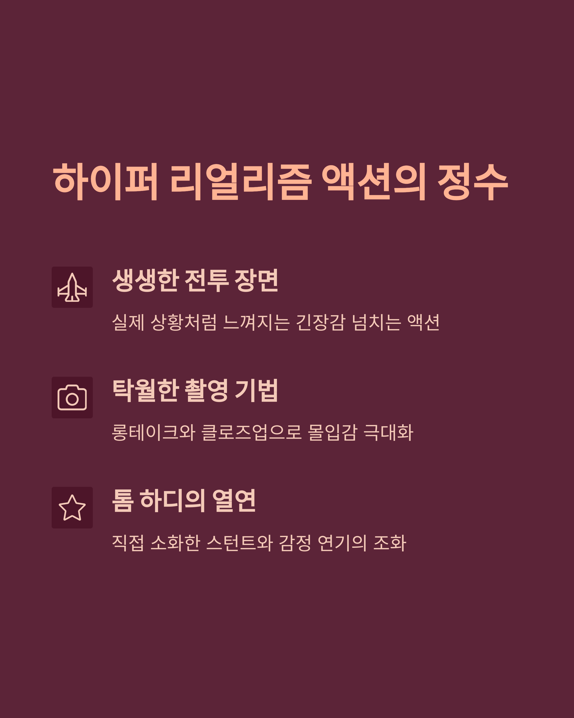 최근 액션 영화는 단순한 스펙터클을 넘어, 리얼리즘과 감정 서사 중심으로 진화하고 있습니다. <해벅>은 이 흐름을 정확히 짚어낸 작품이에요. 주요 트렌드를 정리하면: