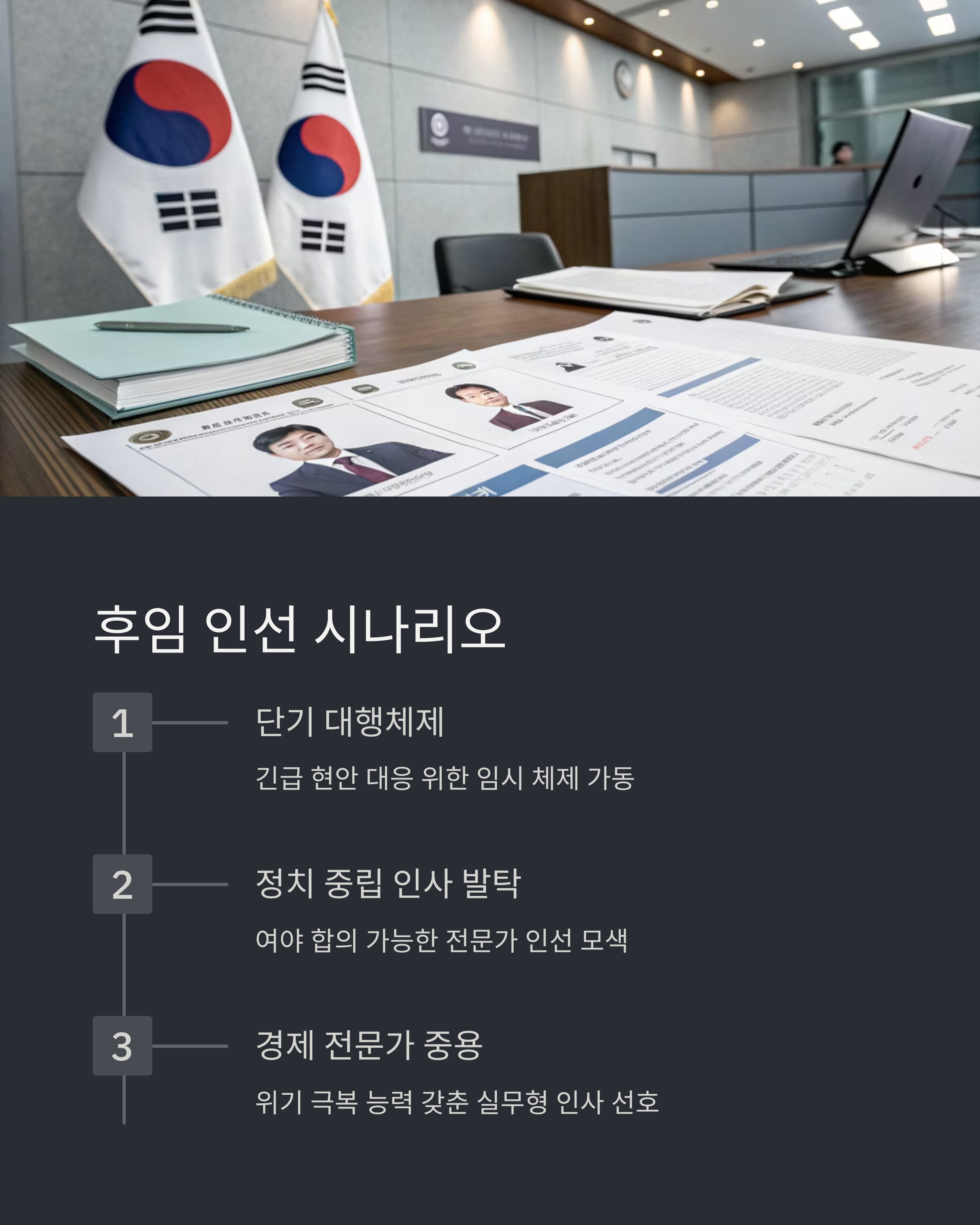 경제수장의 공백은 단순한 자리 비움이 아닙니다. 국정의 구심점이 사라졌다는 뜻이죠. 향후 몇 가지 가능성이 예상됩니다: