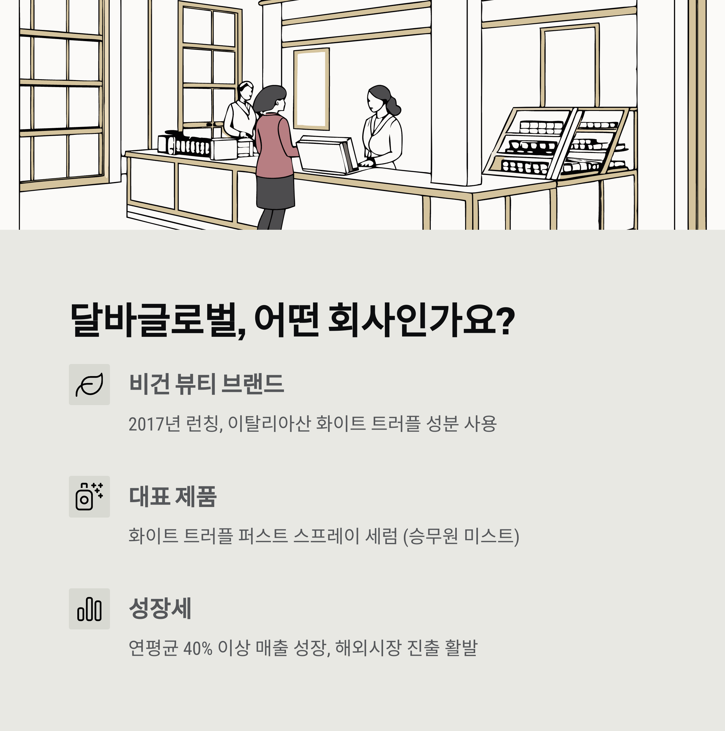 달바글로벌은 2017년 런칭한 비건 뷰티 브랜드 '달바(d'Alba)'를 운영하는 회사입니다. '이탈리아산 화이트 트러플' 성분을 주력으로 사용해서 고급스러운 이미지를 구축했죠. 특히 '화이트 트러플 퍼스트 스프레이 세럼', 일명 승무원 미스트가 엄청난 인기를 끌면서 국내외에서 빠르게 성장했어요.