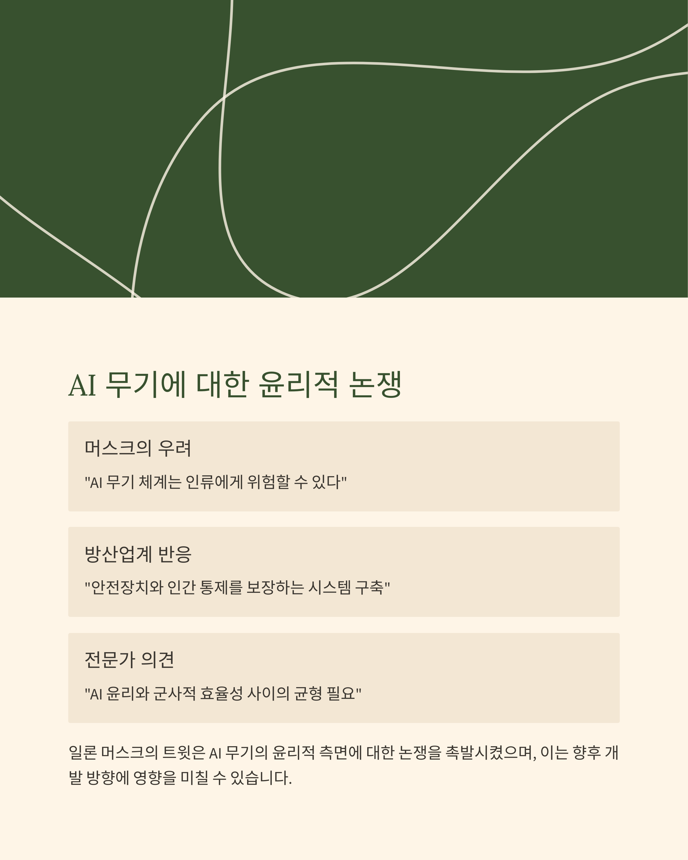 • 머스크는 AI 기반 무기 체계의 윤리 문제를 꾸준히 지적해온 인물