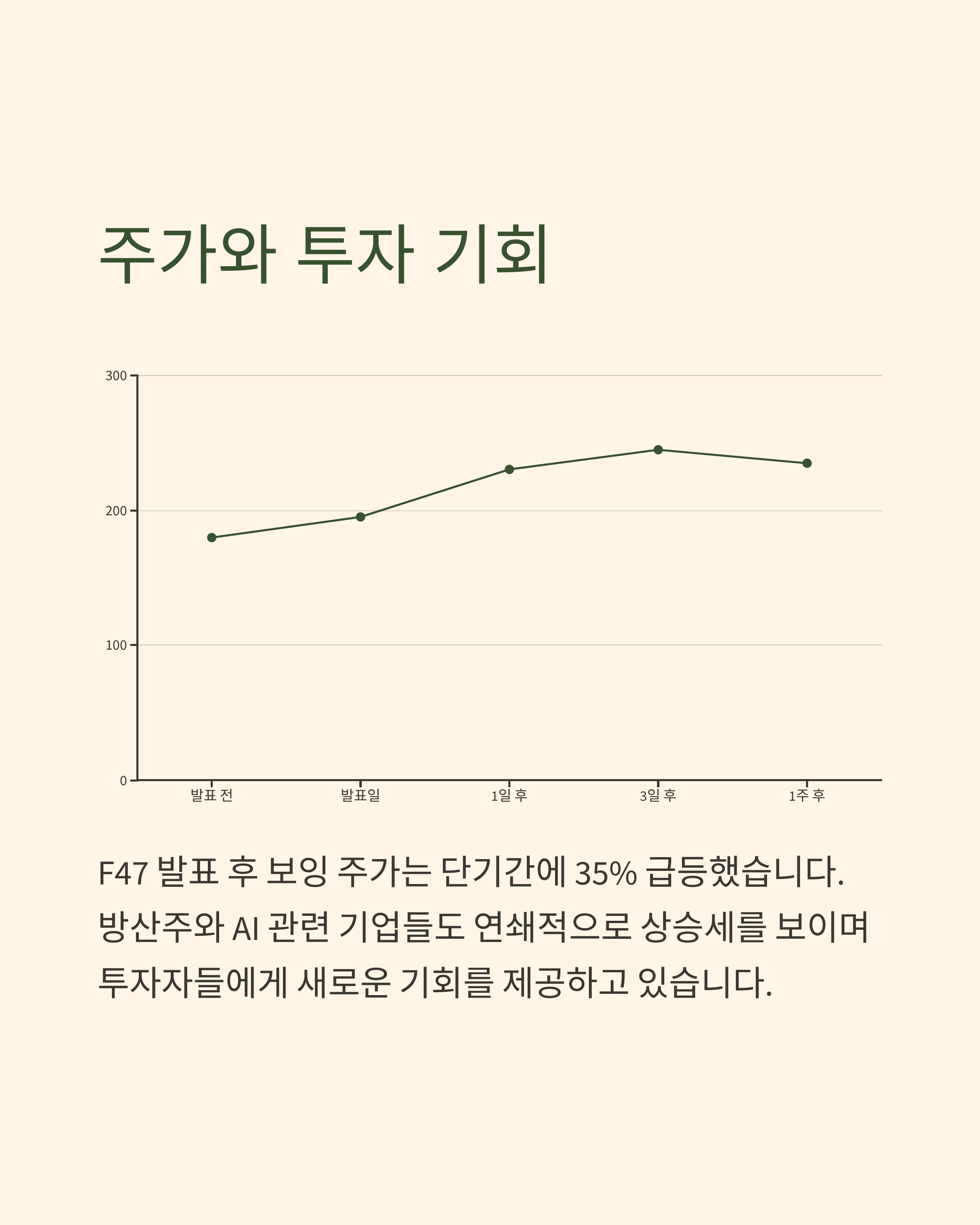 F47 발표 직후 보잉 주가는 뉴욕증시 개장 직후 5.8% 급등했습니다. 그러나 오후 들어 차익 실현 매물이 쏟아지며 상승폭은 줄었고, 종가는 2.4% 상승에 그쳤습니다. 방산 부문에 대한 기대감이 반영된 것으로 보이며, 트럼프의 복귀 가능성과도 연결되어 시장이 민감하게 반응한 것으로 해석됩니다.