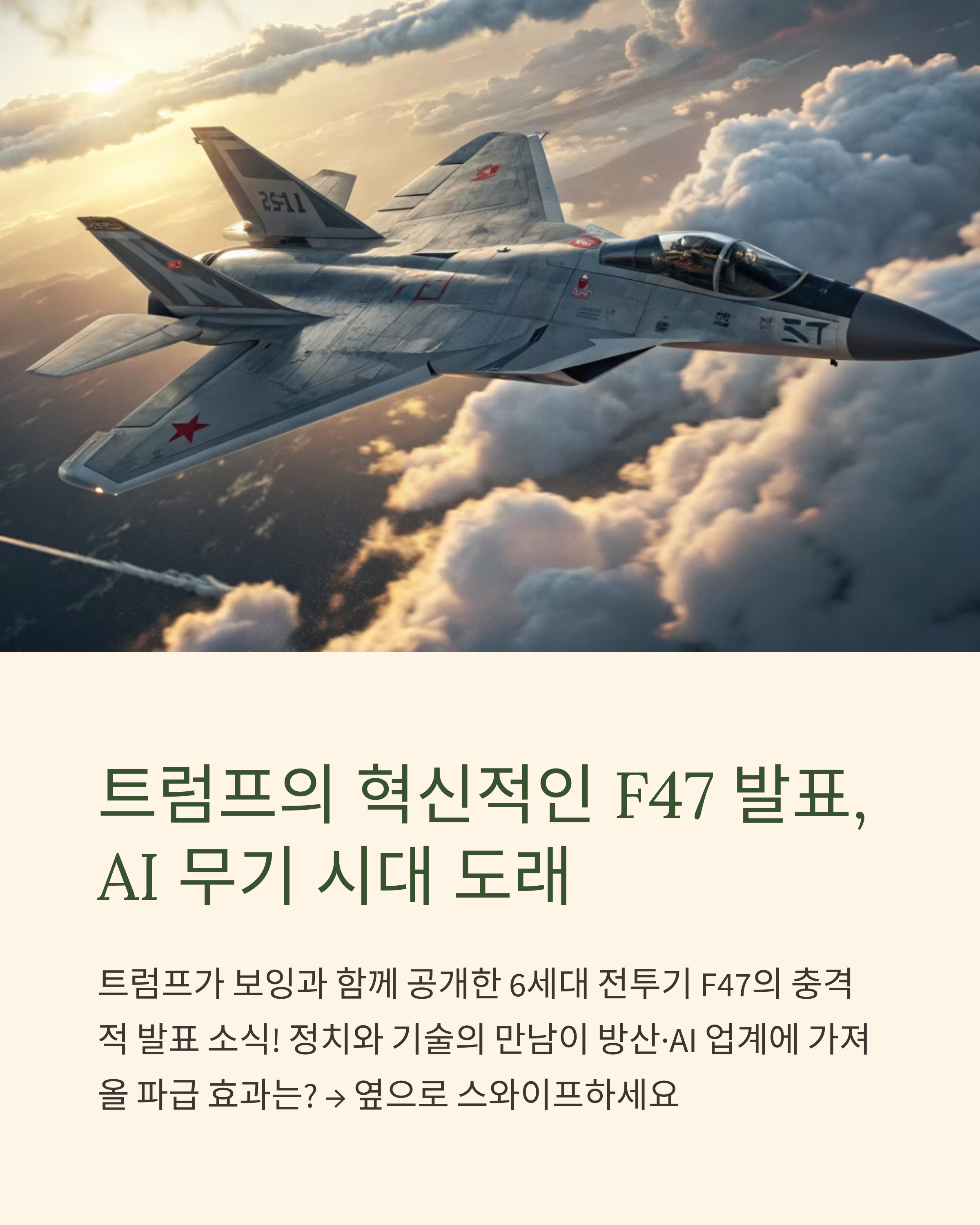 F47 전투기 발표는 그 자체로도 놀라운 뉴스였지만, 트럼프의 타이밍, 머스크의 반응, 그리고 주가의 민감한 흐름까지… 단순한 신제품 공개를 넘어 정치, 기술, 금융이 얽힌 복합적인 사건이었습니다. 이럴 때일수록 단순한 '이슈 쫓기'보다, 깊이 있는 시각으로 흐름을 읽어야겠죠. 여러분은 이번 F47 발표, 어떻게 느끼셨나요? 댓글로 생각 나눠주세요!
