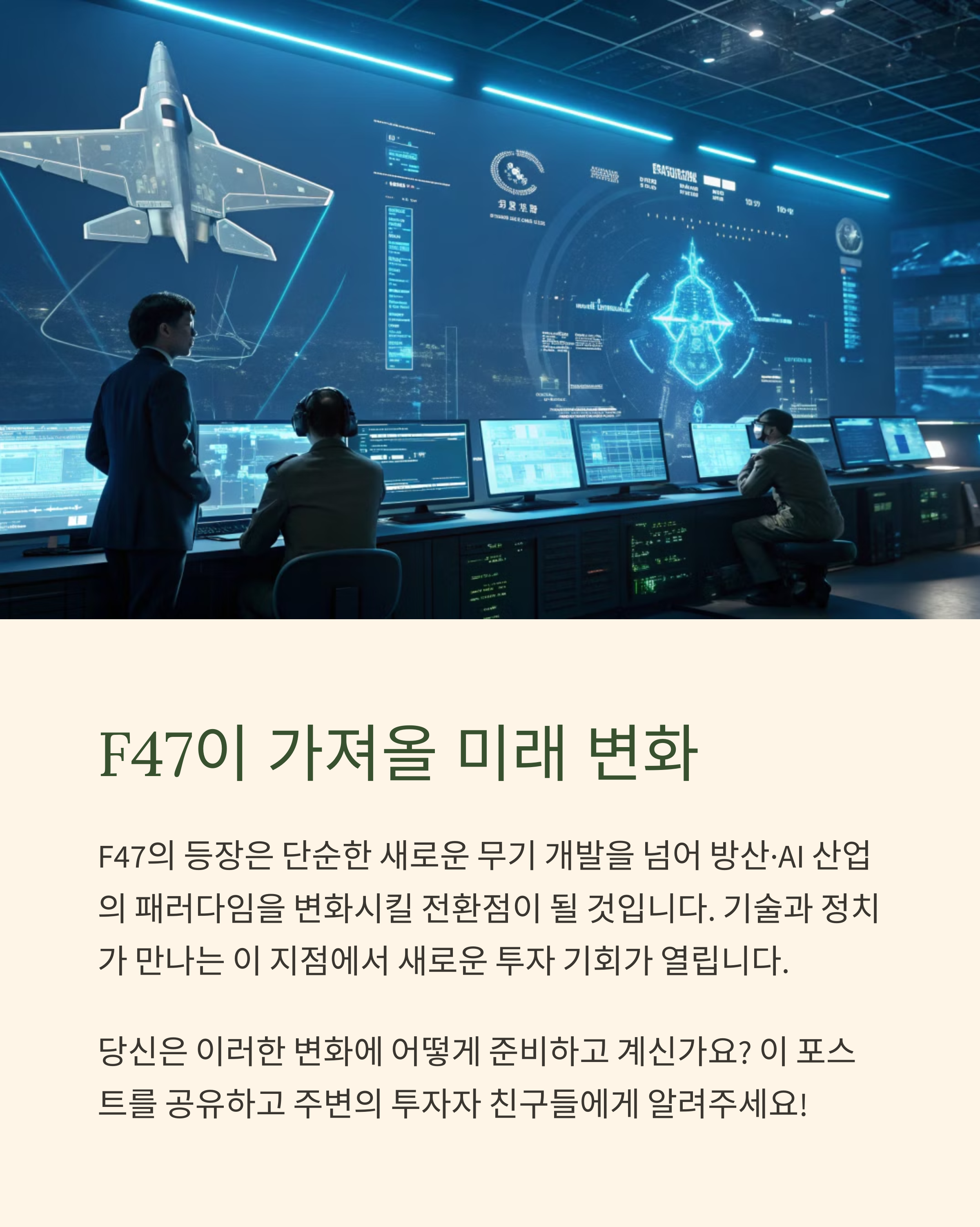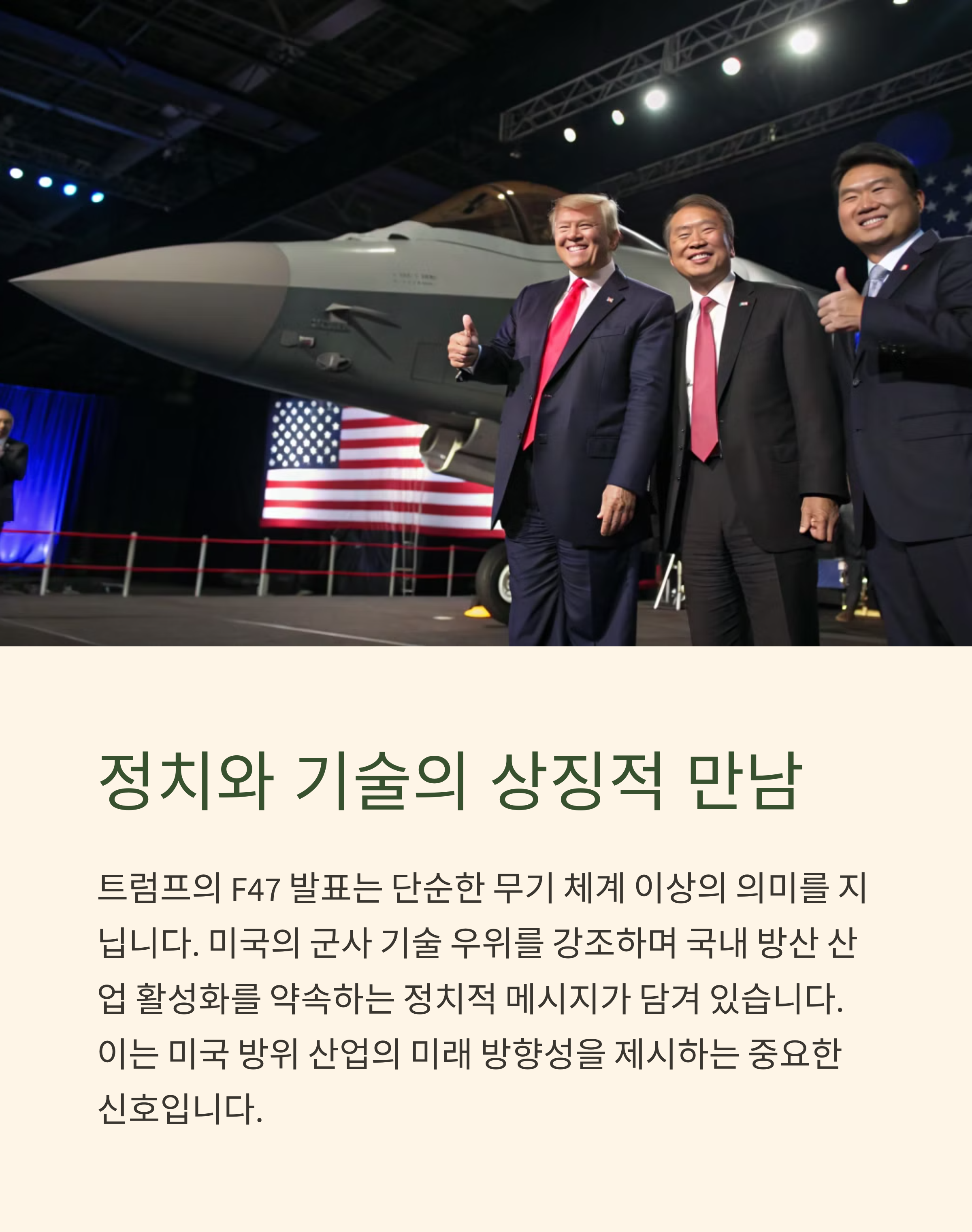 F47 전투기 발표는 그 자체로도 놀라운 뉴스였지만, 트럼프의 타이밍, 머스크의 반응, 그리고 주가의 민감한 흐름까지… 단순한 신제품 공개를 넘어 정치, 기술, 금융이 얽힌 복합적인 사건이었습니다. 이럴 때일수록 단순한 '이슈 쫓기'보다, 깊이 있는 시각으로 흐름을 읽어야겠죠. 여러분은 이번 F47 발표, 어떻게 느끼셨나요? 댓글로 생각 나눠주세요!
